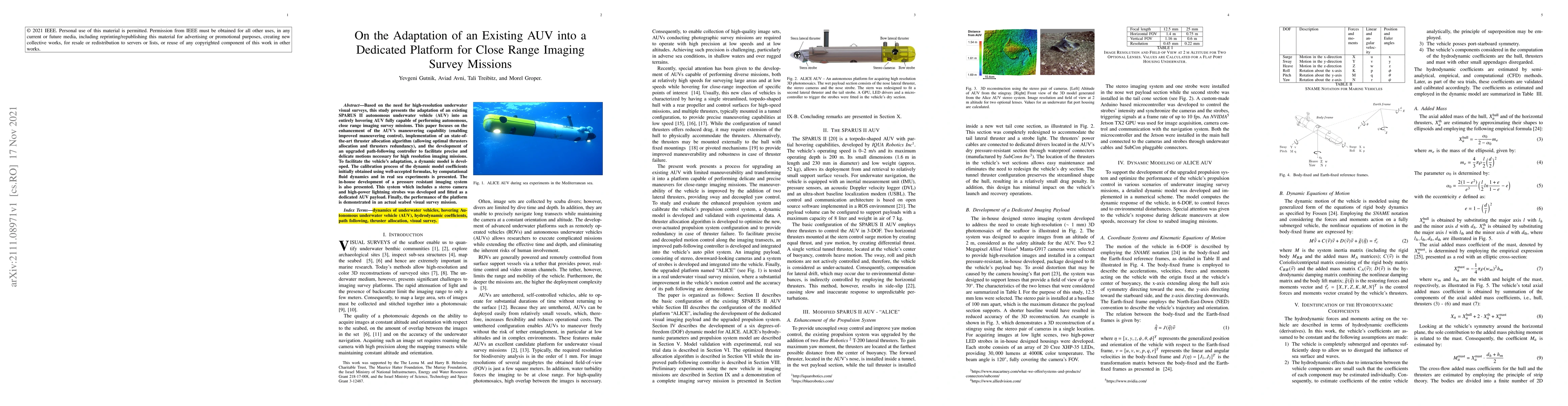 Based on the need for high resolution underwater visual surveys, this study presents the adaptation of an existing SPARUS II autonomous underwater vehicle (AUV) into an entirely hovering AUV fully capable of performing autonomous, close range imaging survey missions. This paper focuses on the enhancement of the AUVs maneuvering capability (enabling improved maneuvering control), implementation of an state of the art thruster allocation algorithm (allowing optimal thrusters allocation and thrusters redundancy), and the development of an upgraded path following controller to facilitate precise and delicate motions necessary for high resolution imaging missions. To facilitate the vehicles adaptation, a dynamic model is developed. The calibration process of the dynamic model coefficients initially obtained using well accepted formulas, by computational fluid dynamics and in real sea experiments is presented. The in house development of a pressure resistant imaging system is also presented. This system which includes a stereo camera and high power lightning strobes was developed and fitted as a dedicated AUV payload. Finally, the performance of the platform is demonstrated in an actual seabed visual survey mission.