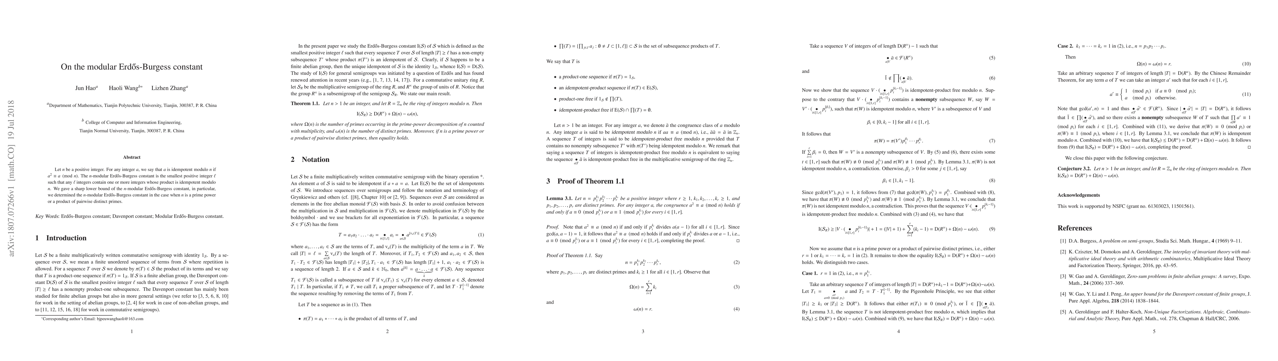 Researchers found a lower bound for the modular Erd\ás-Burgess constant, which is the smallest number of integers needed to guarantee at least one idempotent product modulo n. The constant is sharp in certain cases, such as prime powers and products of distinct primes.