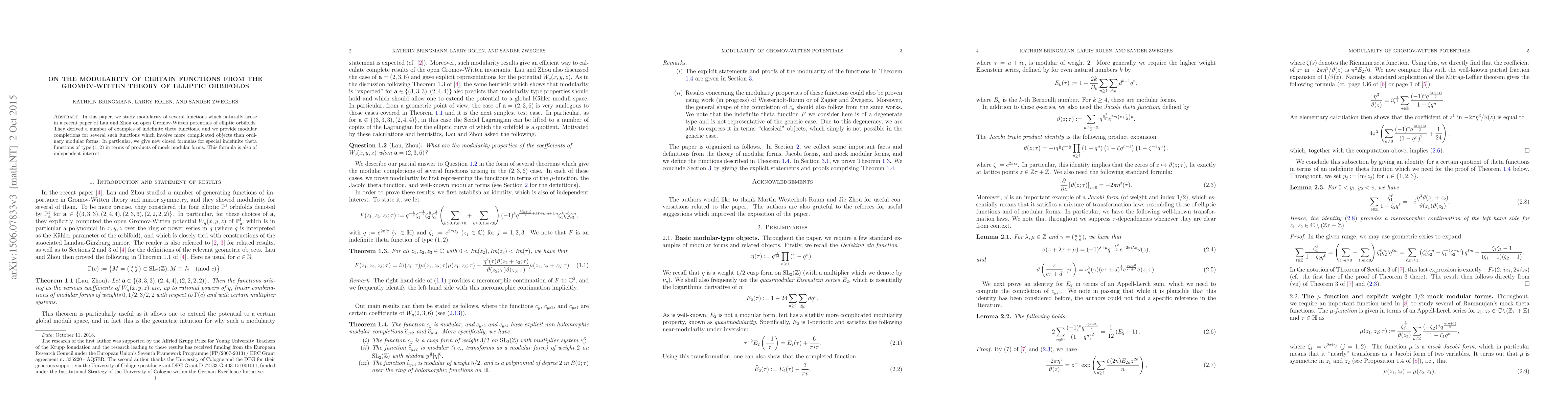 In this paper, we study modularity of several functions which naturally arose in a recent paper of Lau and Zhou on open Gromov-Witten potentials of elliptic orbifolds. They derived a number of examples of indefinite theta functions, and we provide modular completions for several such functions which involve more complicated objects than ordinary modular forms. In particular, we give new closed formulas for special indefinite theta functions of type $(1,2)$ in terms of products of mock modular forms. This formula is also of independent interest.
