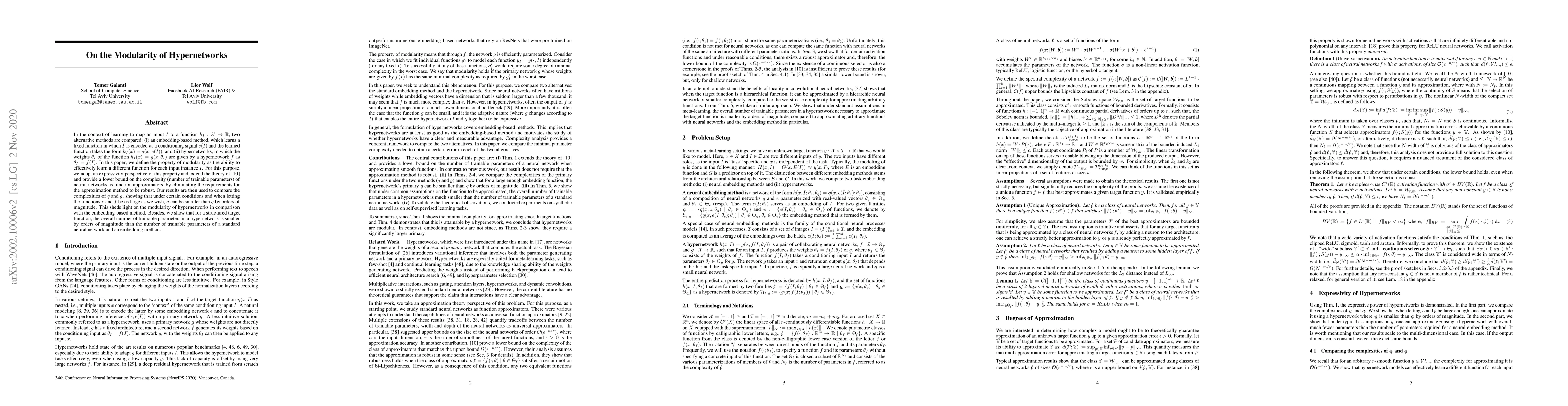 In the context of learning to map an input $I$ to a function $h_I:\mathcal{X}\to \mathbb{R}$, two alternative methods are compared: (i) an embedding-based method, which learns a fixed function in which $I$ is encoded as a conditioning signal $e(I)$ and the learned function takes the form $h_I(x) = q(x,e(I))$, and (ii) hypernetworks, in which the weights $\theta_I$ of the function $h_I(x) = g(x;\theta_I)$ are given by a hypernetwork $f$ as $\theta_I=f(I)$. In this paper, we define the property of modularity as the ability to effectively learn a different function for each input instance $I$. For this purpose, we adopt an expressivity perspective of this property and extend the theory of Devore et al. 1996 and provide a lower bound on the complexity (number of trainable parameters) of neural networks as function approximators, by eliminating the requirements for the approximation method to be robust. Our results are then used to compare the complexities of $q$ and $g$, showing that under certain conditions and when letting the functions $e$ and $f$ be as large as we wish, $g$ can be smaller than $q$ by orders of magnitude. This sheds light on the modularity of hypernetworks in comparison with the embedding-based method. Besides, we show that for a structured target function, the overall number of trainable parameters in a hypernetwork is smaller by orders of magnitude than the number of trainable parameters of a standard neural network and an embedding method.