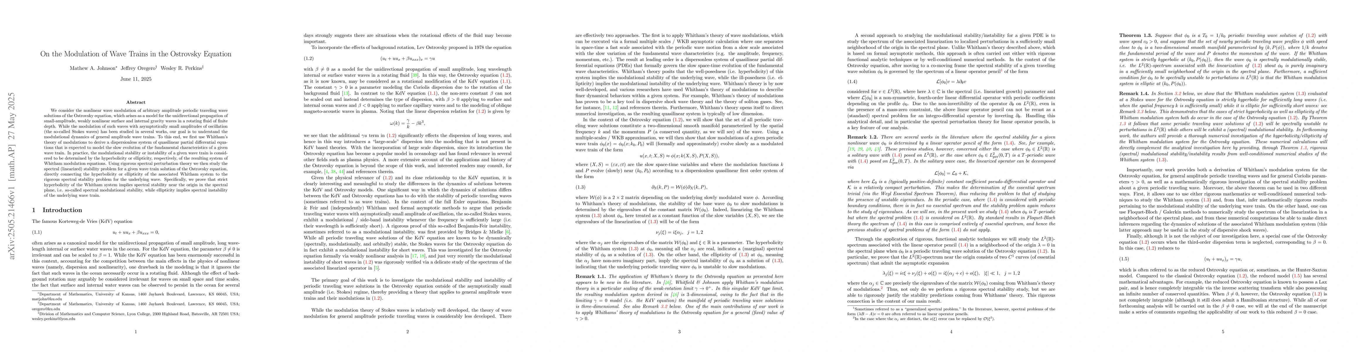 The paper presents a rigorous link between Whitham's modulation equations and spectral stability for wave trains in the Ostrovsky equation, providing a clear criterion for stability based on the nature of the modulation equations.