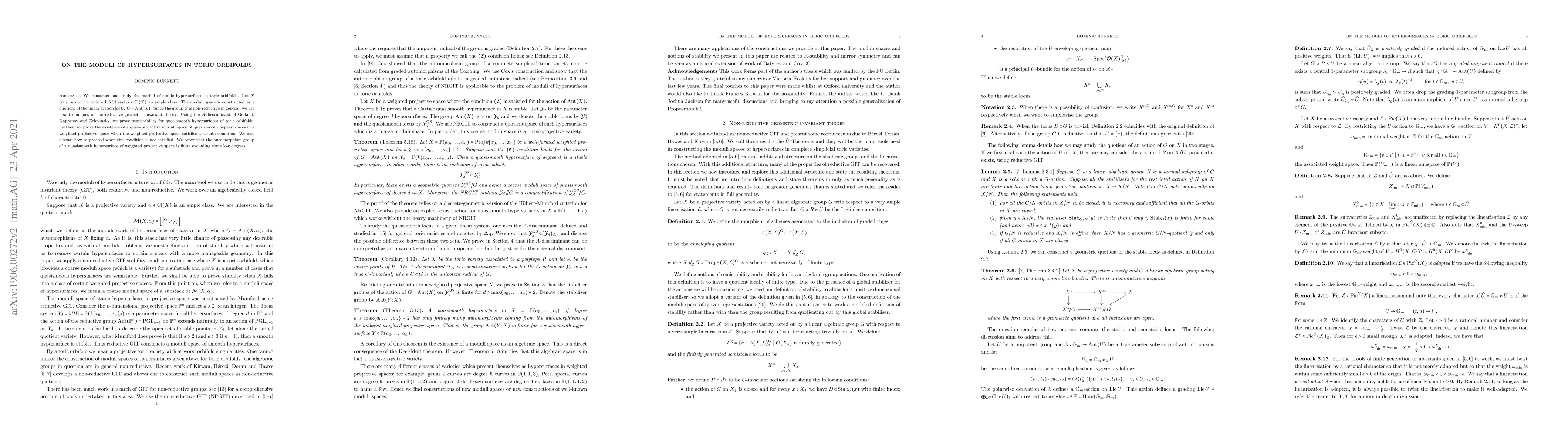 This paper constructs and explores the moduli of hypersurfaces in projective toric orbifolds, employing non-reductive geometric invariant theory. It demonstrates semistability using the $A$-discriminant and proves stability for quasismooth hypersurfaces under specific conditions, concluding with a finite automorphism group for these hypersurfaces.