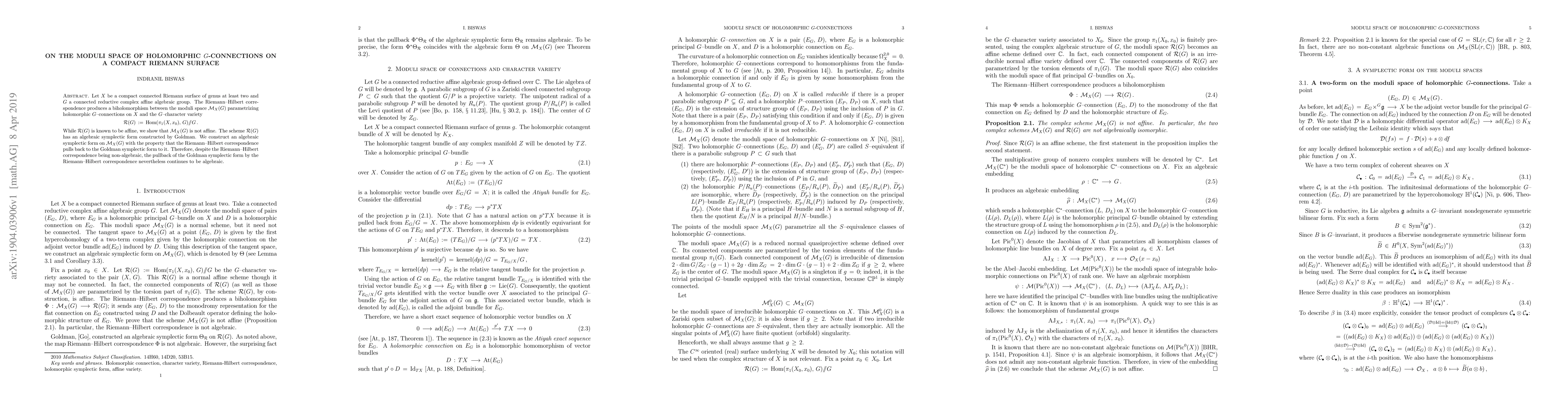 This paper investigates the moduli space of holomorphic $G$-connections on a compact Riemann surface $X$ and demonstrates that it is non-affine, contrasting with its affine character variety ${\mathcal R}(G)$. It constructs an algebraic symplectic form on ${\mathcal M}_X(G)$ consistent with the Goldman symplectic form on ${\mathcal R}(G)$ via the Riemann--Hilbert correspondence.