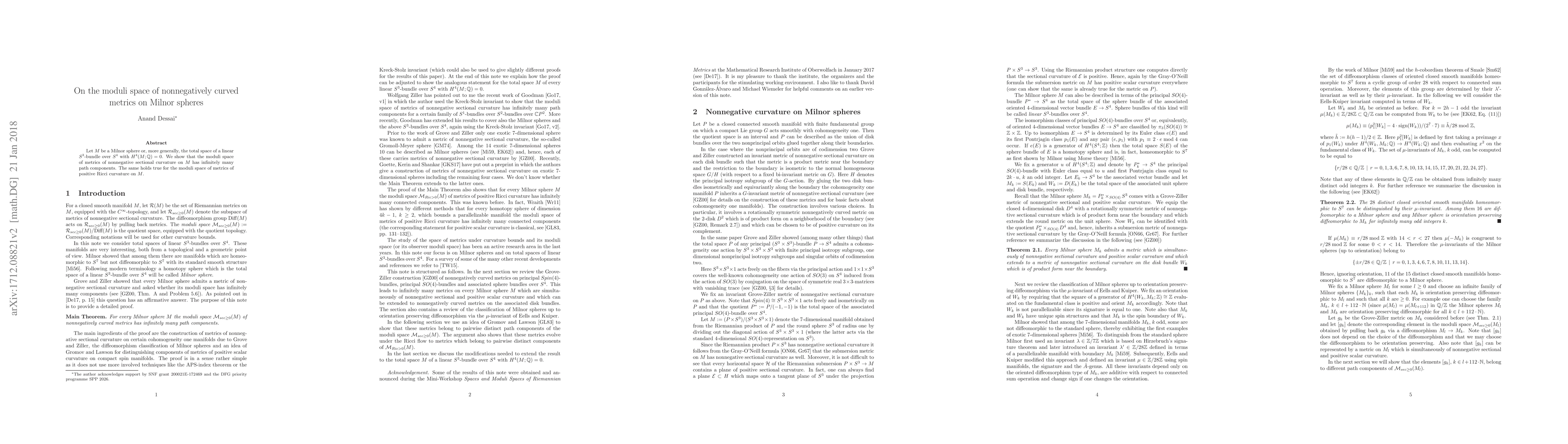 Let $M$ be a Milnor sphere or, more generally, the total space of a linear $S^3$-bundle over $S^4$ with $H^4(M;\mathbb{Q})=0$. We show that the moduli space of metrics of nonnegative sectional curvature on $M$ has infinitely many path components. The same holds true for the moduli space of metrics of positive Ricci curvature on $M$.
