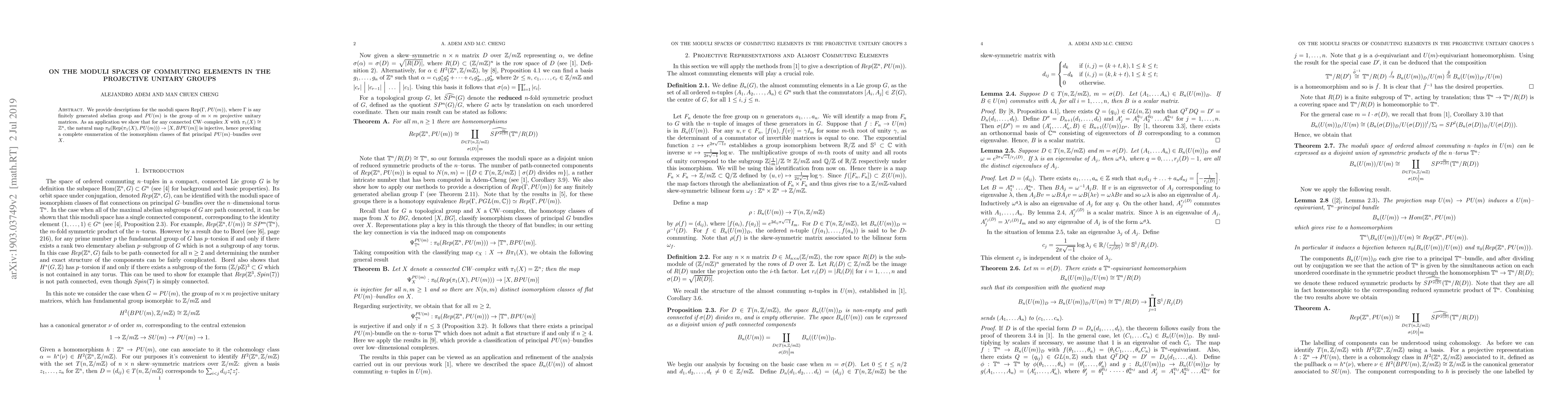 We provide descriptions for the moduli spaces $\text{Rep}(\Gamma, PU(m))$, where $\Gamma$ is any finitely generated abelian group and $PU(m)$ is the group of $m\times m$ projective unitary matrices. As an application we show that for any connected CW-complex $X$ with $\pi_1(X)\cong \mathbf{Z}^n$, the natural map $\pi_0(\text{Rep}(\pi_1(X), PU(m)))\to [X, BPU(m)]$ is injective, hence providing a complete enumeration of the isomorphism classes of flat principal $PU(m)$-bundles over $X$.