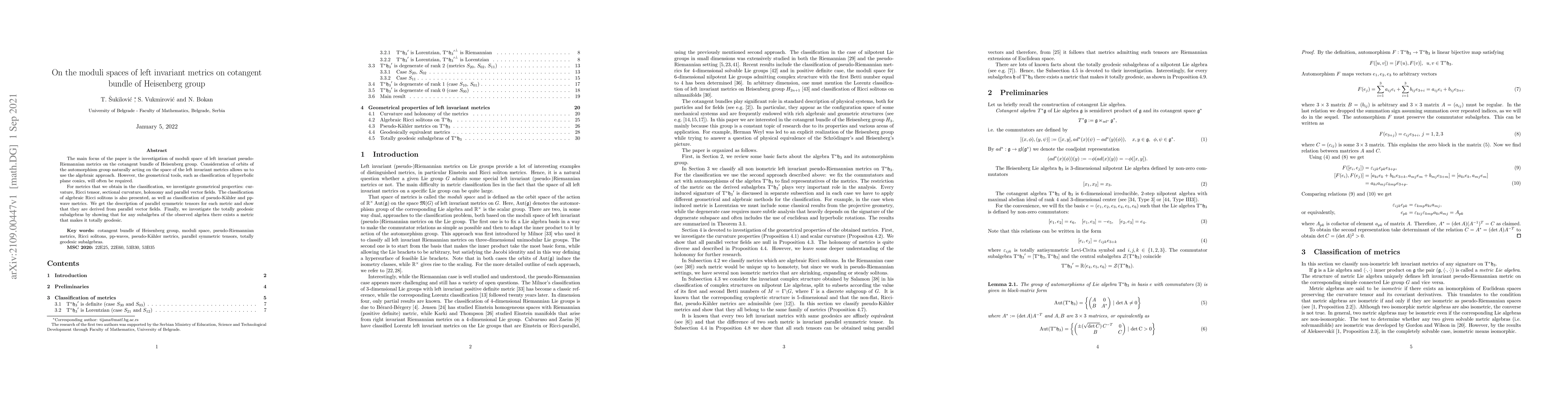 The main focus of the paper is the investigation of moduli space of left invariant pseudoRiemannian metrics on the cotangent bundle of Heisenberg group. Consideration of orbits of the automorphism group naturally acting on the space of the left invariant metrics allows us to use the algebraic approach. However, the geometrical tools, such as classification of hyperbolic plane conics, will often be required. For metrics that we obtain in the classification, we investigate geometrical properties: curvature, Ricci tensor, sectional curvature, holonomy and parallel vector fields. The classification of algebraic Ricci solitons is also presented, as well as classification of pseudo-Kahler and ppwave metrics. We get the description of parallel symmetric tensors for each metric and showthat they are derived from parallel vector fields. Finally, we investigate the totally geodesic subalgebras by showing that for any subalgebra of the observed algebra there exists a metric that makes it totally geodesic.