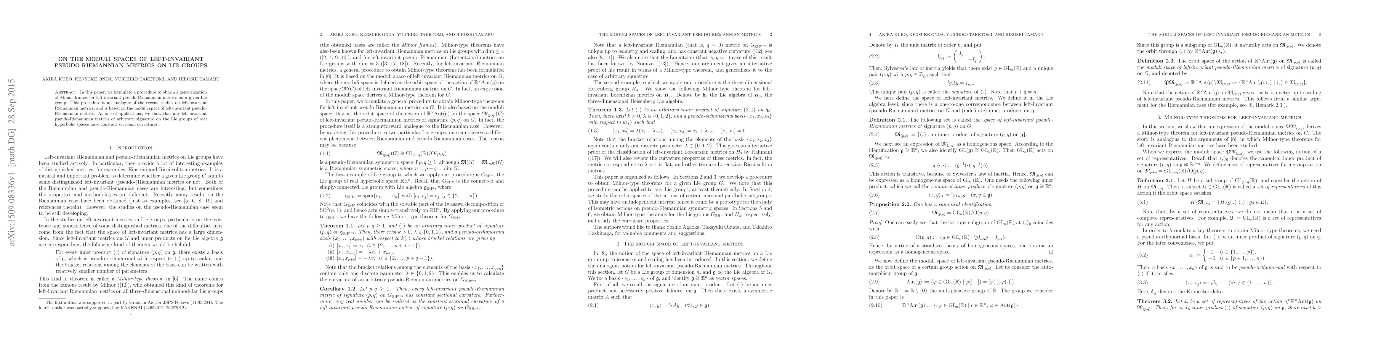 In this paper, we formulate a procedure to obtain a generalization of Milnor frames for left-invariant pseudo-Riemannian metrics on a given Lie group. This procedure is an analogue of the recent studies on left-invariant Riemannian metrics, and is based on the moduli space of left-invariant pseudo-Riemannian metrics. As one of applications, we show that any left-invariant pseudo-Riemannian metrics of arbitrary signature on the Lie groups of real hyperbolic spaces have constant sectional curvatures.
