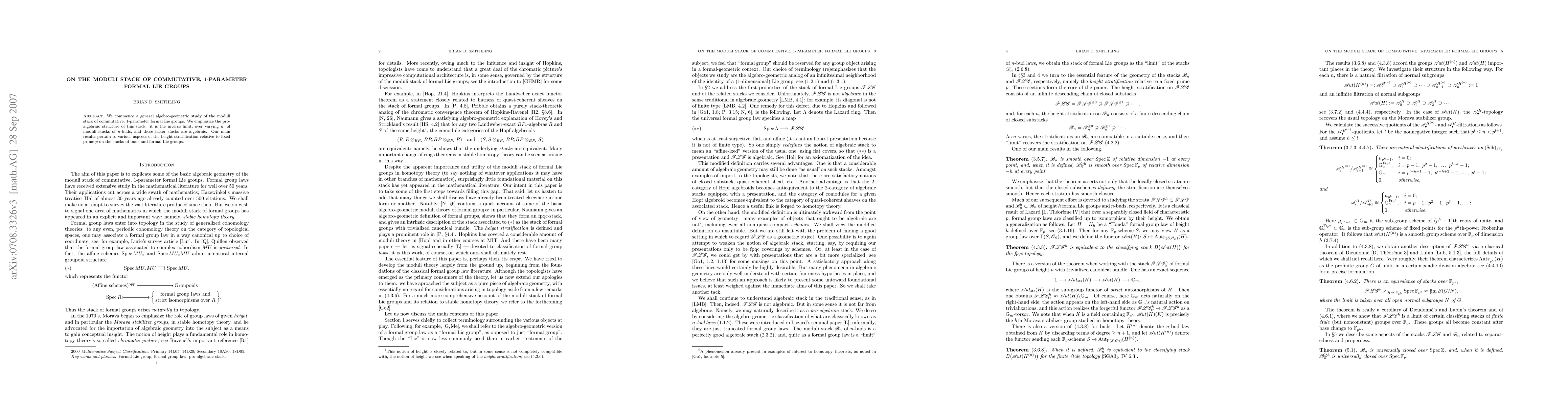 We attempt to develop a general algebro-geometric study of the moduli stack of commutative, 1-parameter formal Lie groups. We emphasize the pro-algebraic structure of this stack: it is the inverse limit, over varying n, of moduli stacks of n-buds, and these latter stacks are algebraic. Our main results pertain to aspects of the height stratification relative to fixed prime p on the stacks of buds and formal Lie groups. We conclude with a largely expository account of some foundational material on limits in bicategories.