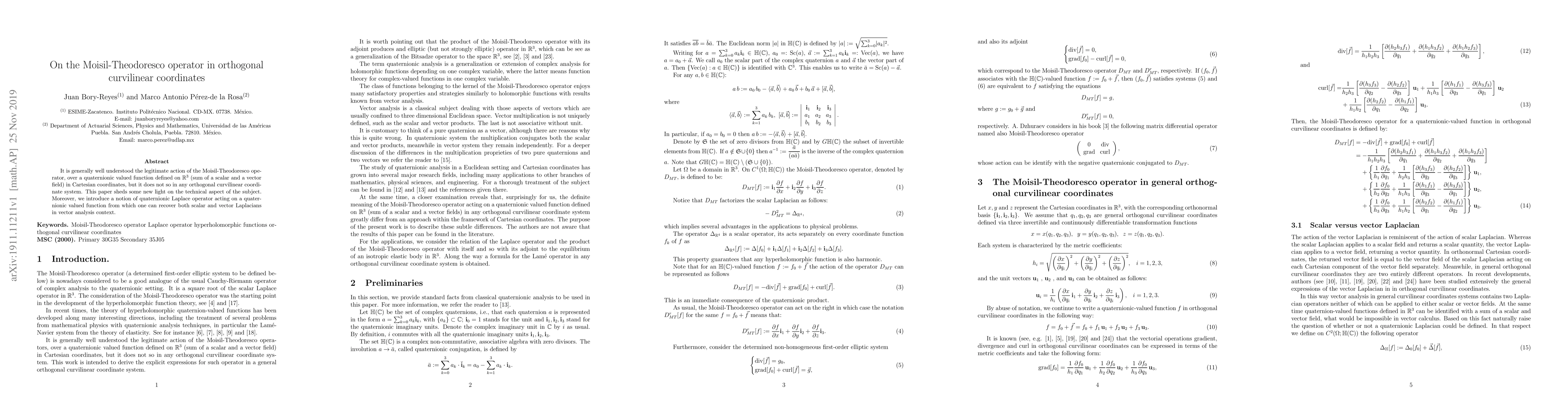 This paper explores the application of the Moisil-Theodoresco operator in orthogonal curvilinear coordinates, addressing its lesser-understood behavior in such systems. It introduces a quaternionic Laplace operator that recovers both scalar and vector Laplacians in vector analysis.