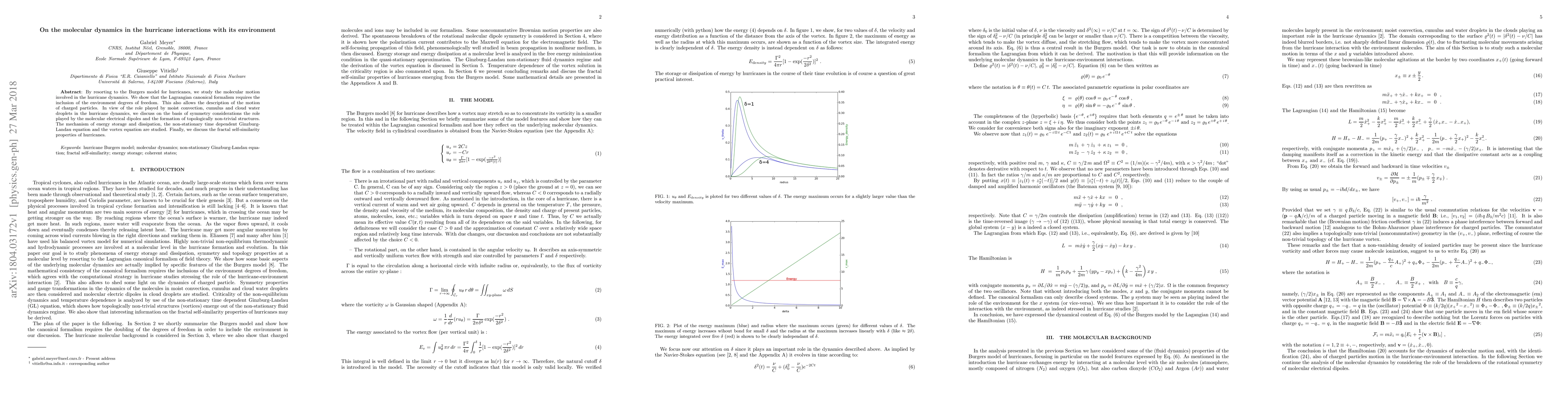 By resorting to the Burgers model for hurricanes, we study the molecular motion involved in the hurricane dynamics. We show that the Lagrangian canonical formalism requires the inclusion of the environment degrees of freedom. This also allows the description of the motion of charged particles. In view of the role played by moist convection, cumulus and cloud water droplets in the hurricane dynamics, we discuss on the basis of symmetry considerations the role played by the molecular electrical dipoles and the formation of topologically non-trivial structures. The mechanism of energy storage and dissipation, the non-stationary time dependent Ginzburg-Landau equation and the vortex equation are studied. Finally, we discuss the fractal self-similarity properties of hurricanes.