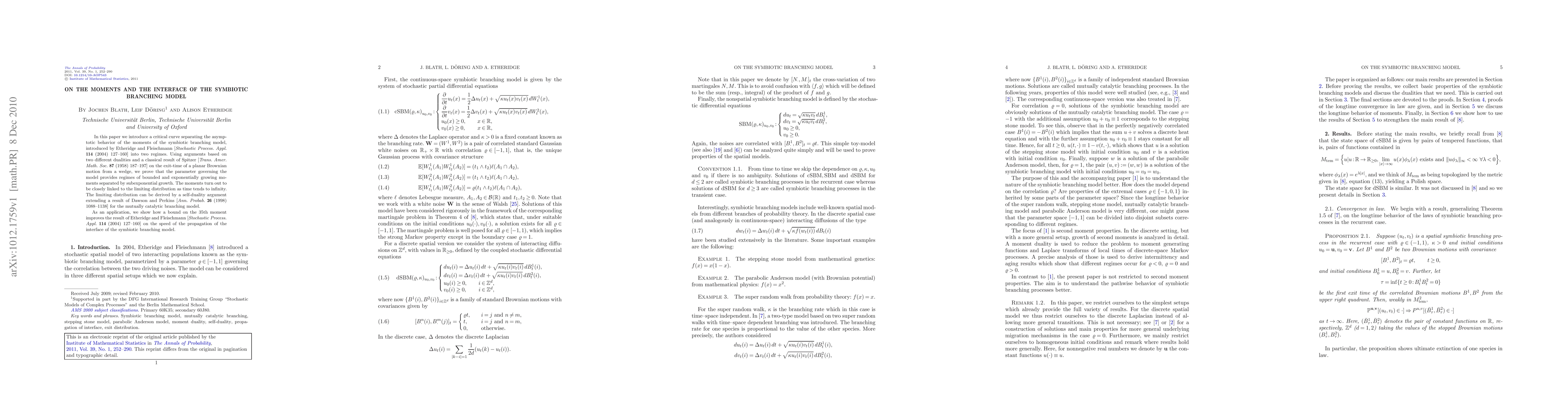 This paper identifies a critical curve that separates the asymptotic behavior of the moments in the symbiotic branching model into regimes of bounded and exponentially growing moments. It uses dualities and results from planar Brownian motion to derive the limiting distribution and improve the propagation speed of the model's interface.