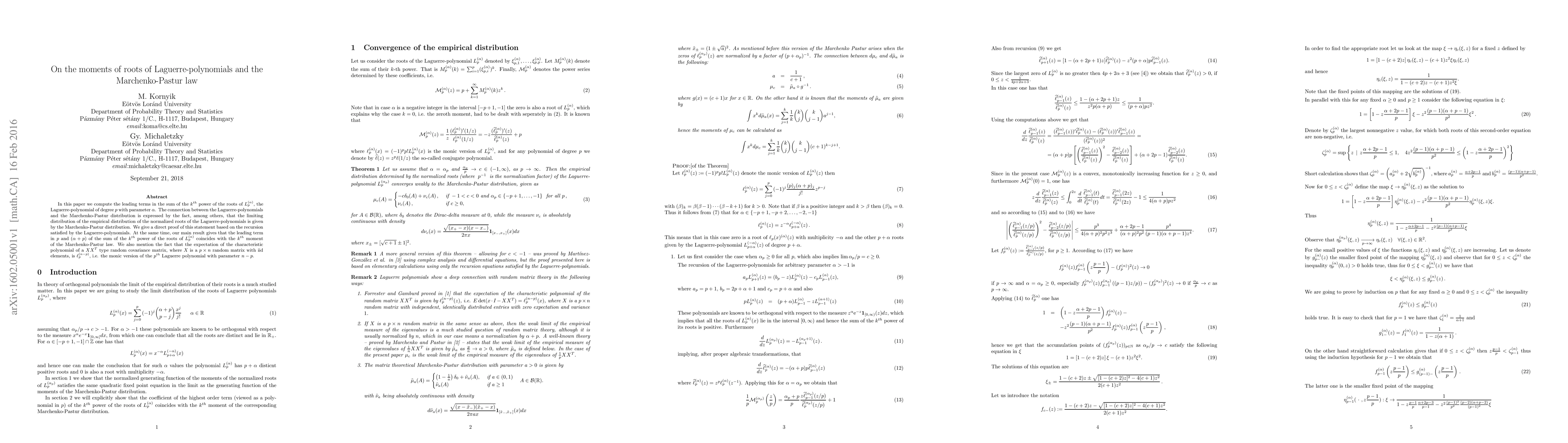 In this paper we compute the leading terms in the sum of the $k^{th}$ power of the roots of $L_{p}^{(\alpha)}$, the Laguerre-polynomial of degree $p$ with parameter $\alpha$. The connection between the Laguerre-polynomials and the Marchenko-Pastur distribution is expressed by the fact, among others, that the limiting distribution of the empirical distribution of the normalized roots of the Laguerre-polynomials is given by the Marchenko-Pastur distribution. We give a direct proof of this statement based on the recursion satisfied by the Laguerre-polynomials. At the same time, our main result gives that the leading term in $p$ and $(\alpha+p)$ of the sum of the $k^{th}$ power of the roots of $L_{p}^{(\alpha)}$ coincides with the $k^{th}$ moment of the Marchenko-Pastur law. We also mention the fact that the expectation of the characteristic polynomial of a $XX^T$ type random covariance matrix, where $X$ is a $p\times n$ random matrix with iid elements, is $\ell^{(n-p)}_p$, i.e. the monic version of the $p^{th}$ Laguerre polynomial with parameter $n-p$.