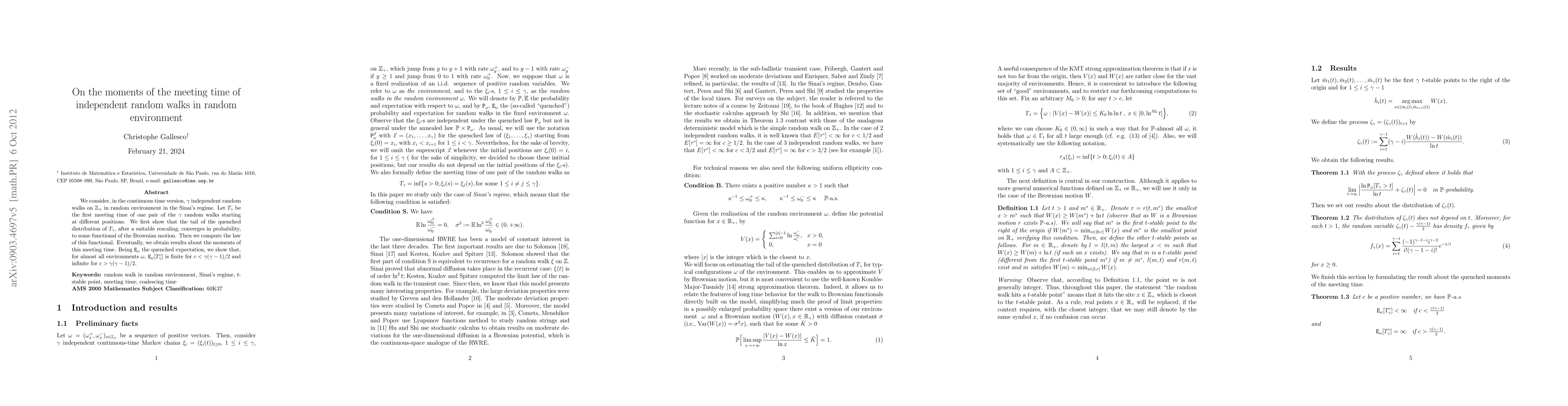 This paper investigates the meeting time of $\gamma$ independent random walks in a random environment, showing that the rescaled tail distribution converges to a functional of Brownian motion. It concludes that the moments of the meeting time are finite for exponents less than $\gamma(\gamma-1)/2$ and infinite for greater exponents.