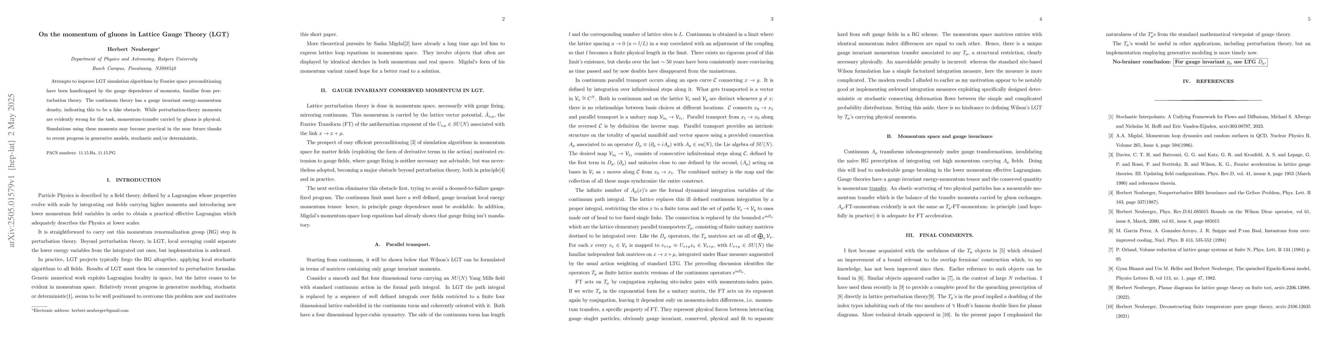 Attempts to improve LGT simulation algorithms by Fourier space preconditioning have been handicapped by the gauge dependence of momenta, familiar from perturbation theory. The continuum theory has a gauge invariant energy-momentum density, indicating this to be a fake obstacle. While perturbation-theory momenta are evidently wrong for the task, momentum-transfer carried by gluons is physical. Simulations using these momenta may become practical in the near future thanks to recent progress in generative models, stochastic and/or deterministic.