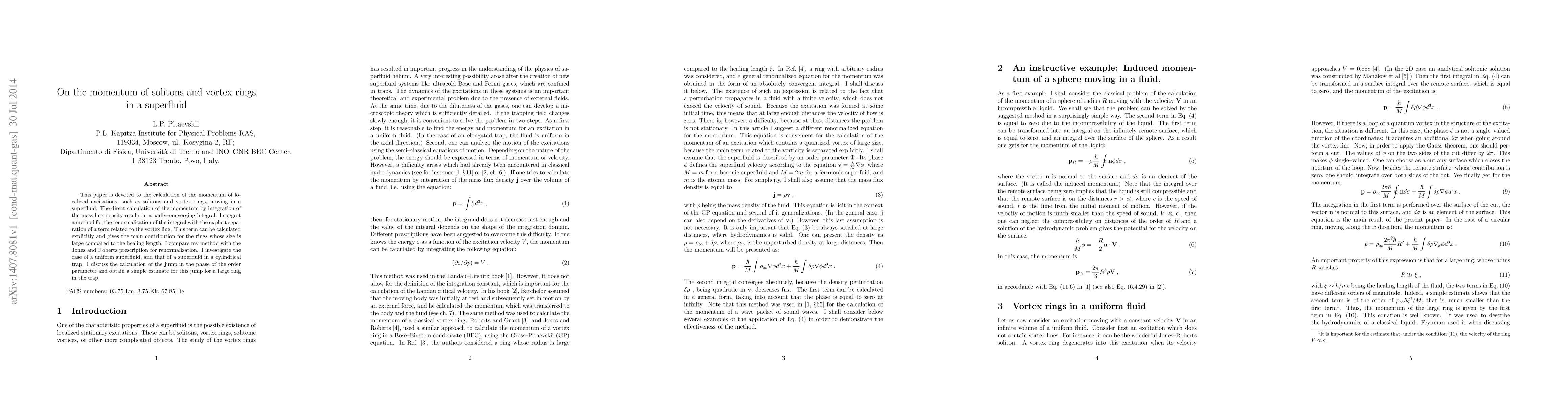 This paper calculates the momentum of solitons and vortex rings in a superfluid, addressing the issue of convergence in the integral calculation. It proposes a renormalization method that separates and explicitly calculates a vortex line-related term, providing a more accurate result for large rings compared to the healing length.