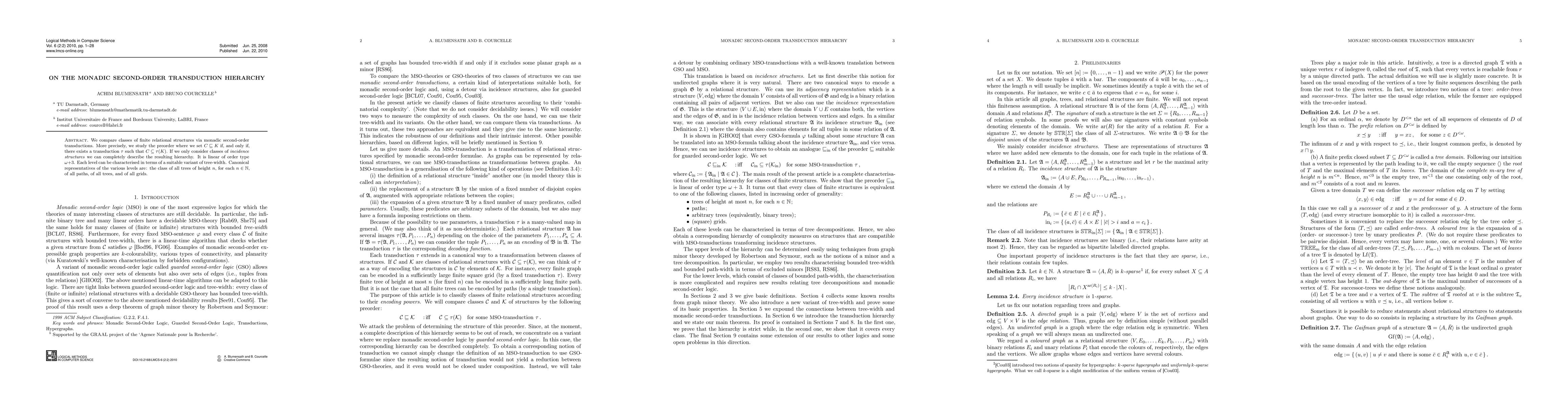 Researchers studied how to compare classes of finite relational structures using a hierarchical system called monadic second-order transduction, finding that the hierarchy is linear with 3 levels.