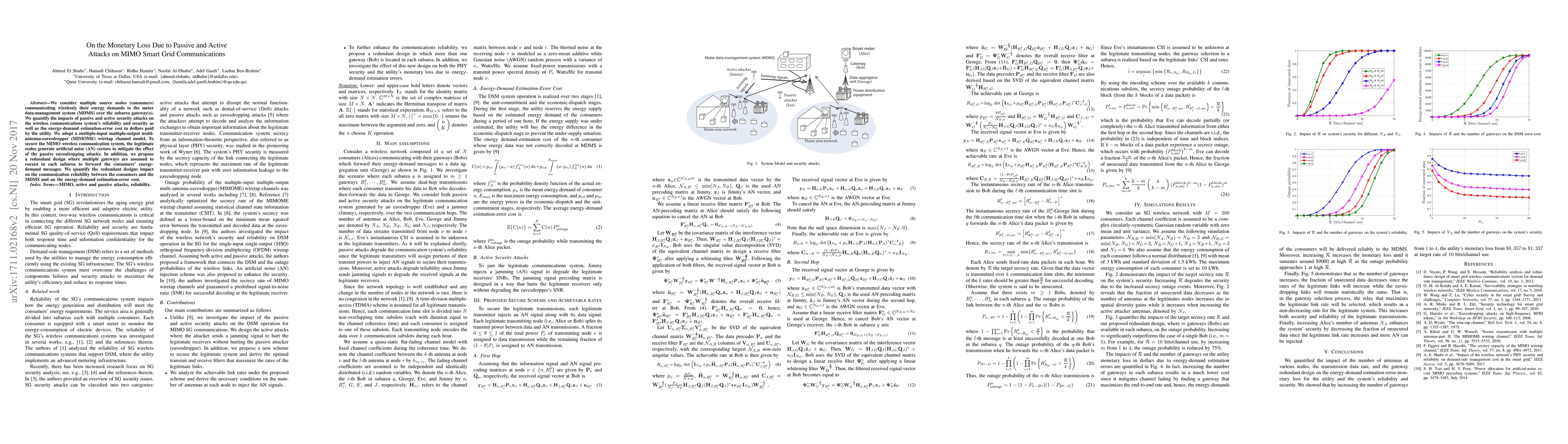 We consider multiple source nodes (consumers) communicating wirelessly their energy demands to the meter data-management system (MDMS) over the subarea gateway(s). We quantify the impacts of passive and active security attacks on the wireless communications system's reliability and security as well as the energy-demand estimation-error cost in dollars paid by the utility. We adopt a multiple-input multiple-output multi-antenna-eavesdropper (MIMOME) wiretap channel model. To secure the MIMO wireless communication system, the legitimate nodes generate artificial noise (AN) vectors to mitigate the effect of the passive eavesdropping attacks. In addition, we propose a redundant design where multiple gateways are assumed to coexist in each subarea to forward the consumers' energy-demand messages. We quantify the redundant designs impact on the communication reliability between the consumers and the MDMS and on the energy-demand estimation-error cost.
