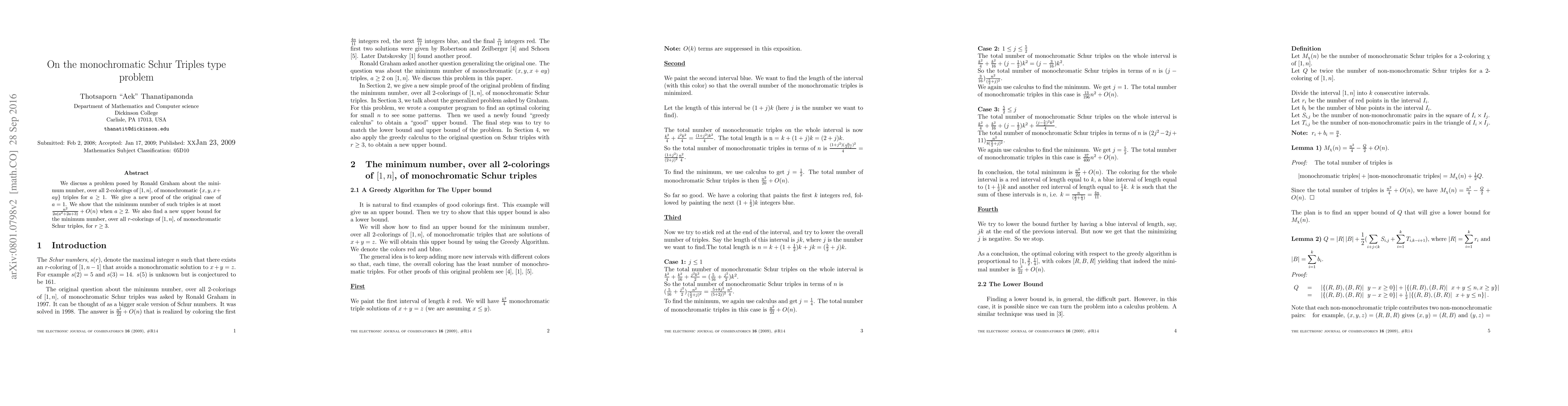 This paper addresses a monochromatic Schur triples problem posed by Ronald Graham, providing a new proof for the case when $a=1$ and deriving an upper bound for the minimum number of monochromatic triples for $a \geq 2$ and $r \geq 3$ in all 2-colorings and $r$-colorings respectively.