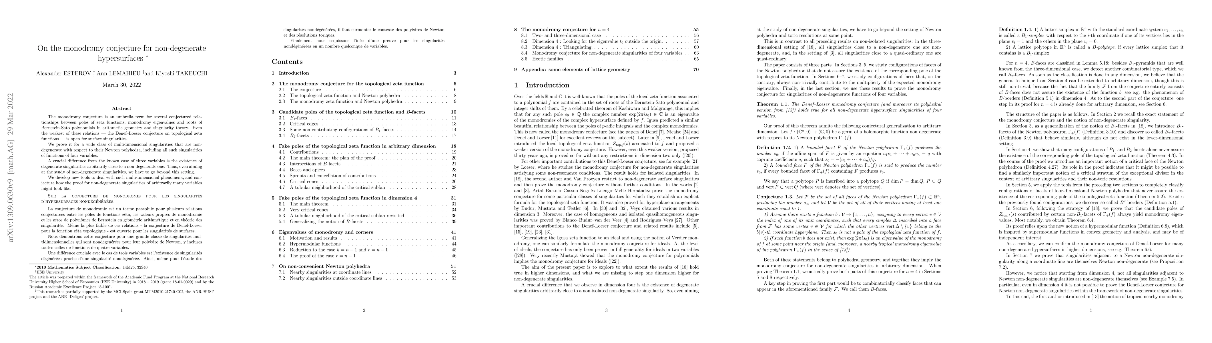The monodromy conjecture is an umbrella term for several conjectured relationships between poles of zeta functions, monodromy eigenvalues and roots of Bernstein-Sato polynomials in arithmetic geometry and singularity theory. Even the weakest of these relations -- the Denef--Loeser conjecture on topological zeta functions -- is open for surface singularities. We prove it for a wide class of multidimensional singularities that are non-degenerate with respect to their Newton polyhedra, including all such singularities of functions of four variables. A crucial difference from the known case of three variables is the existence of degenerate singularities arbitrarily close to a non-degenerate one. Thus, even aiming at the study of non-degenerate singularities, we have to go beyond this setting. We develop new tools to deal with such multidimensional phenomena, and conjecture how the proof for non-degenerate singularities of arbitrarily many variables might look like.