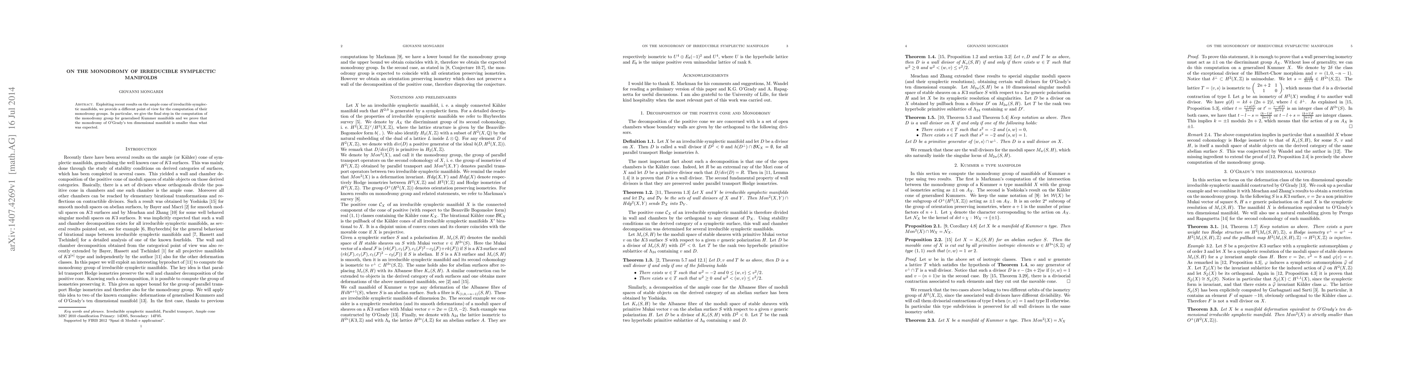 This paper offers a novel approach to calculating the monodromy groups of irreducible symplectic manifolds, concluding the computation for generalised Kummer manifolds and revealing that the monodromy of O'Grady's ten-dimensional manifold is smaller than previously anticipated.