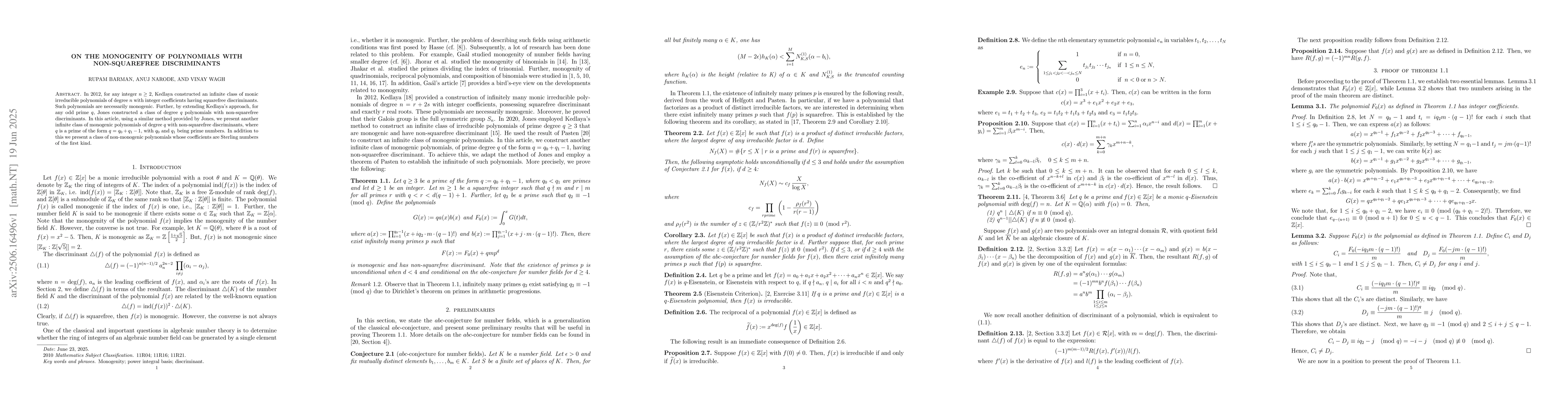 In 2012, for any integer $n \ge 2$, Kedlaya constructed an infinite class of monic irreducible polynomials of degree $n$ with integer coefficients having squarefree discriminants. Such polynomials are necessarily monogenic. Further, by extending Kedlaya's approach, for any odd prime $q$, Jones constructed a class of degree $q$ polynomials with non-squarefree discriminants. In this article, using a similar method provided by Jones, we present another infinite class of monogenic polynomials of degree $q$ with non-squarefree discriminants, where $q$ is a prime of the form $ q = q_0 + q_1 - 1 $, with $ q_0 $ and $ q_1 $ being prime numbers. In addition to this we present a class of non-monogenic polynomials whose coefficients are Sterling numbers of the first kind.