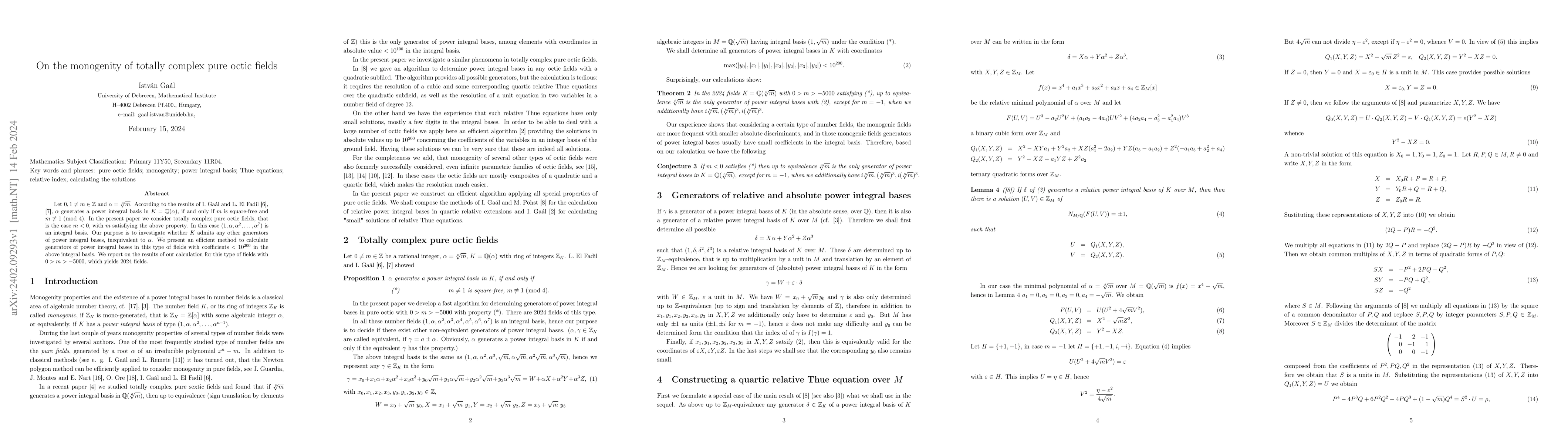 This paper investigates the monogenity of totally complex pure octic fields generated by $\alpha=\sqrt[8]{m}$ under specific conditions, finding that $(1,\alpha,\alpha^2,\ldots,\alpha^7)$ forms an integral basis. It presents a method to calculate alternative generators of power integral bases and reports on 2024 such fields for $m$ in the range $-5000 < m < 0$.