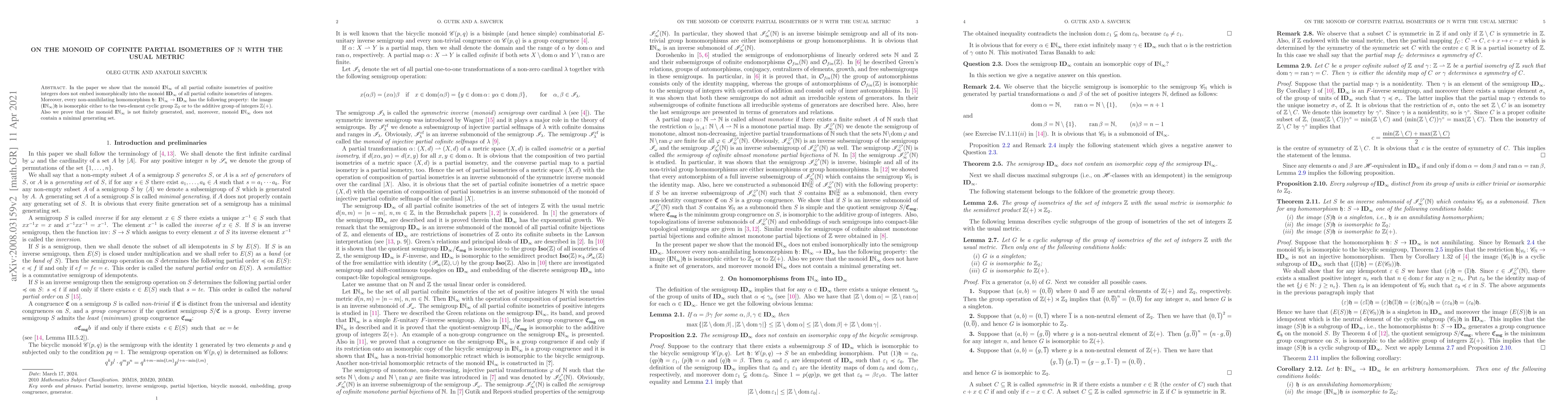 The paper demonstrates that the monoid $\mathbf{I}\mathbb{N}_{\infty}$ of partial cofinite isometries of positive integers does not embed into the monoid $\mathbf{ID}_{\infty}$ of integers. It also shows that any non-annihilating homomorphism from $\mathbf{I}\mathbb{N}_{\infty}$ to $\mathbf{ID}_{\infty}$ maps the image to either $\mathbb{Z}_2$ or $\mathbb{Z}(+)$.