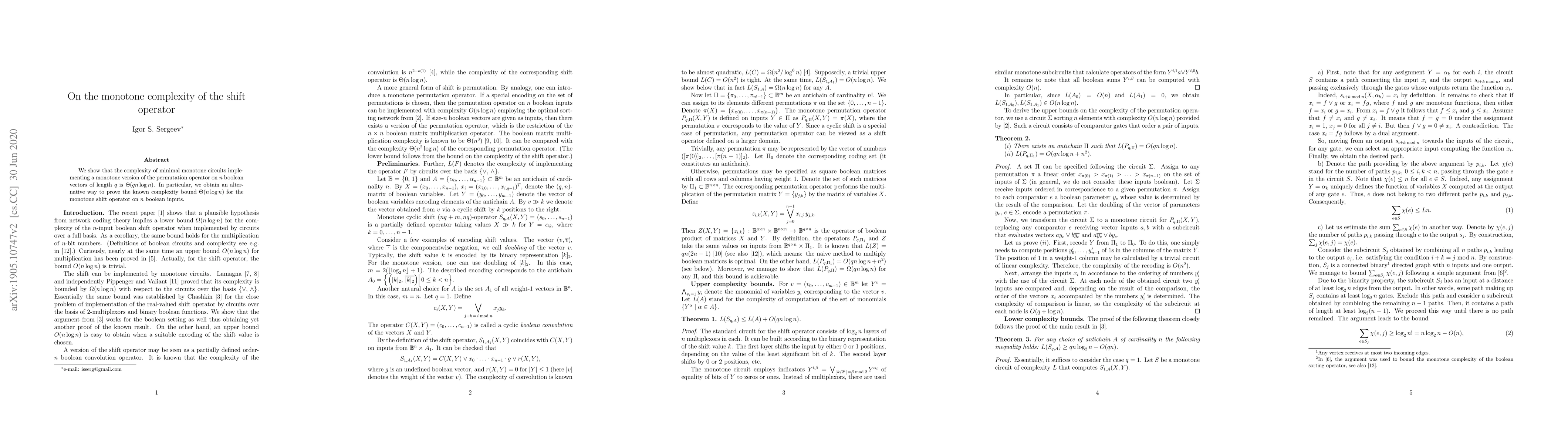 We show that the complexity of minimal monotone circuits implementing a monotone version of the permutation operator on $n$ boolean vectors of length $q$ is $\Theta(qn\log n)$. In particular, we obtain an alternative way to prove the known complexity bound $\Theta(n\log n)$ for the monotone shift operator on $n$ boolean inputs.