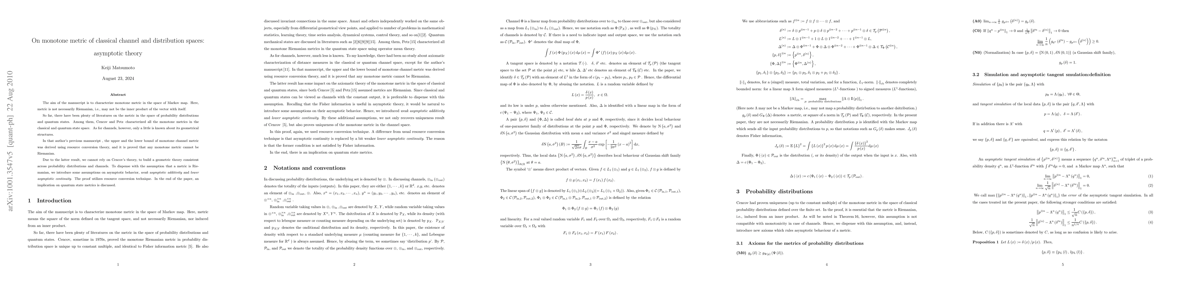 This paper characterizes the monotone metric in the space of Markov maps, focusing on its non-Riemannian nature and introducing assumptions on its asymptotic behavior. It aims to develop a geometric theory for channels independent of Riemannian metrics, using resource conversion theory and discussing implications for quantum state metrics.