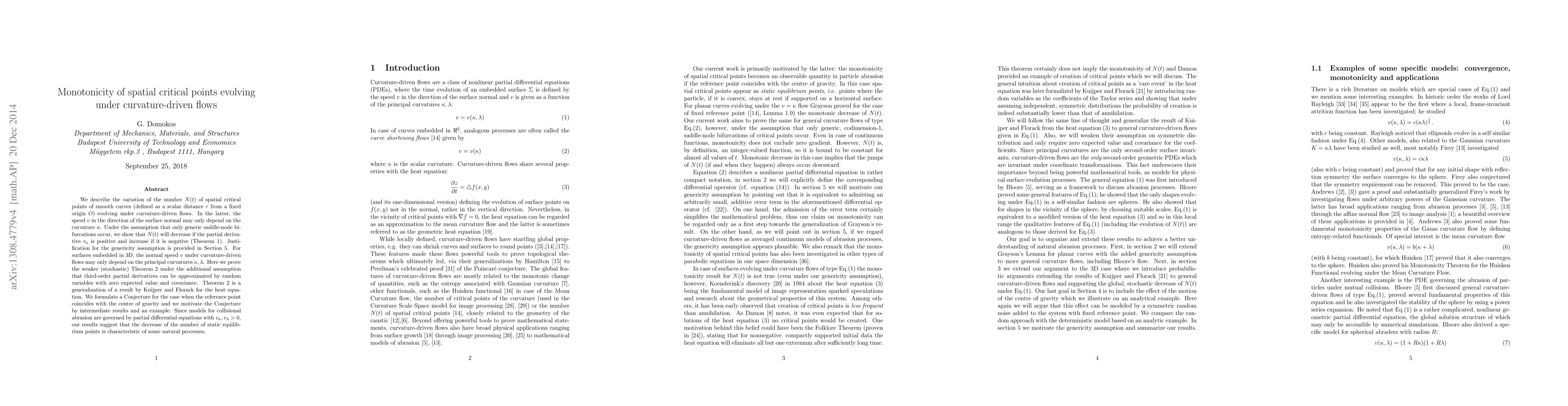 We describe the variation of the number $N(t)$ of spatial critical points of smooth curves (defined as a scalar distance $r$ from a fixed origin $O$) evolving under curvature-driven flows. In the latter, the speed $v$ in the direction of the surface normal may only depend on the curvature $\kappa$. Under the assumption that only generic saddle-node bifurcations occur, we show that $N(t)$ will decrease if the partial derivative $v_{\kappa}$ is positive and increase if it is negative (Theorem 1). Justification for the genericity assumption is provided in Section 5. For surfaces embedded in 3D, the normal speed $v$ under curvature-driven flows may only depend on the principal curvatures $\kappa, \lambda$. Here we prove the weaker (stochastic) Theorem 2 under the additional assumption that third-order partial derivatives can be approximated by random variables with zero expected value and covariance. Theorem 2 is a generalization of a result by Kuijper and Florack for the heat equation. We formulate a Conjecture for the case when the reference point coincides with the centre of gravity and we motivate the Conjecture by intermediate results and an example. Since models for collisional abrasion are governed by partial differential equations with $v_{\kappa},v_{\lambda}>0$, our results suggest that the decrease of the number of static equilibrium points is characteristic of some natural processes.