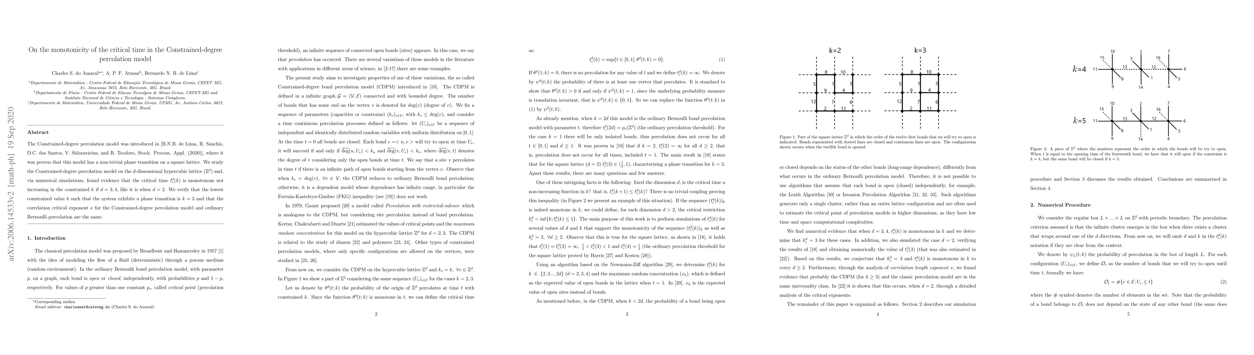 This paper investigates the monotonicity of the critical time in the Constrained-degree percolation model on $d$-dimensional hypercubic lattices, finding evidence that $t_{c}^{d}(k)$ is non-increasing for $d=3,4$ and confirming that the lowest $k$ for a phase transition is $k=3$.