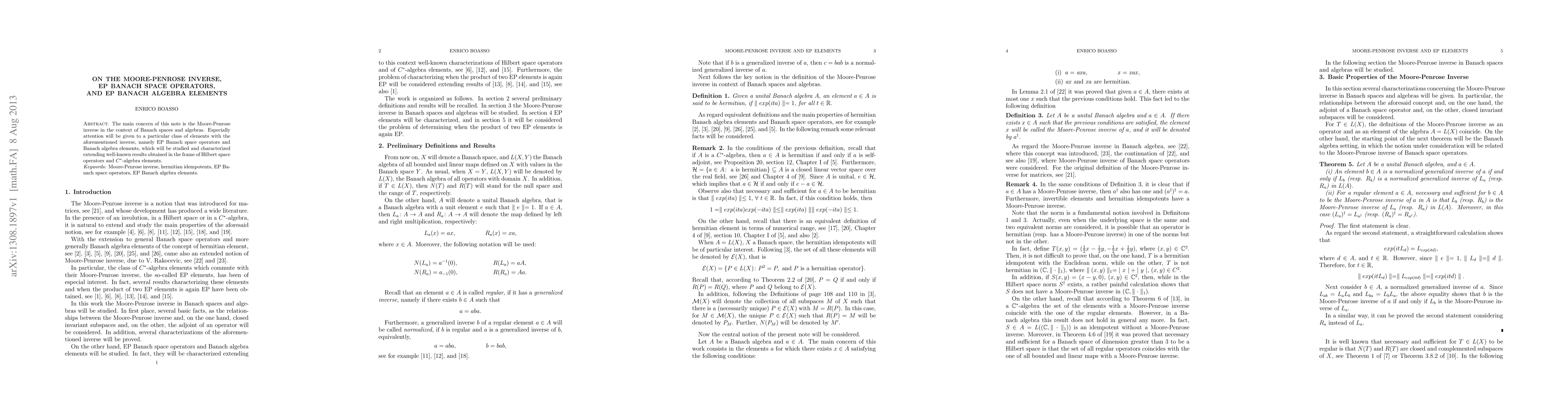 This paper explores the Moore-Penrose inverse in Banach spaces and algebras, focusing on EP Banach space operators and Banach algebra elements, extending known results from Hilbert space operators and $C^*$-algebra elements.