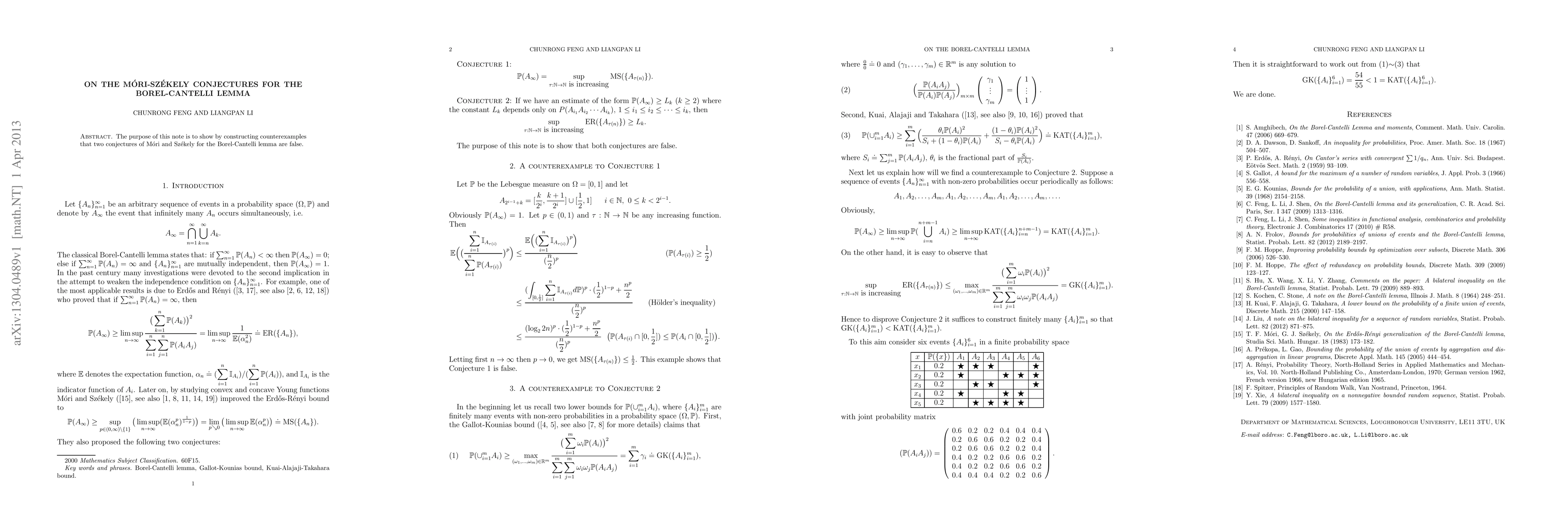 Researchers disprove two conjectures by Szekely and Mori on the Borel-Cantelli lemma, showing that counterexamples exist.