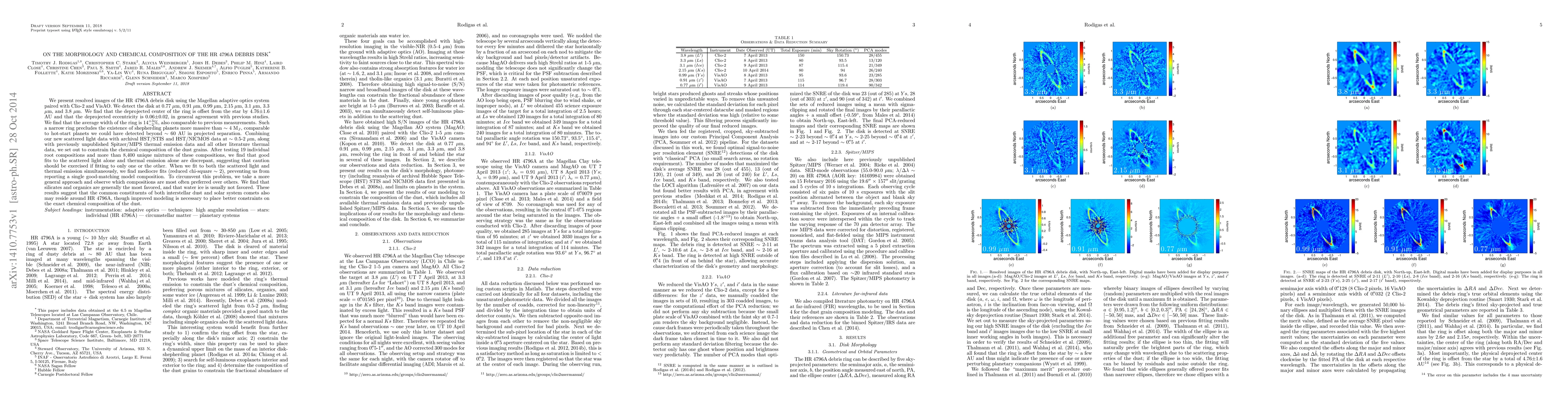 [abridged] We present resolved images of the HR 4796A debris disk using the Magellan adaptive optics system paired with Clio-2 and VisAO. We detect the disk at 0.77 \microns, 0.91 \microns, 0.99 \microns, 2.15 \microns, 3.1 \microns, 3.3 \microns, and 3.8 \microns. We find that the deprojected center of the ring is offset from the star by 4.76$\pm$1.6 AU and that the deprojected eccentricity is 0.06$\pm$0.02, in general agreement with previous studies. We find that the average width of the ring is 14$^{+3}_{-2}%$, also comparable to previous measurements. Such a narrow ring precludes the existence of shepherding planets more massive than \about 4 \mj, comparable to hot-start planets we could have detected beyond \about 60 AU in projected separation. Combining our new scattered light data with archival HST/STIS and HST/NICMOS data at \about 0.5-2 \microns, along with previously unpublished Spitzer/MIPS thermal emission data and all other literature thermal data, we set out to constrain the chemical composition of the dust grains. After testing 19 individual root compositions and more than 8,400 unique mixtures of these compositions, we find that good fits to the scattered light alone and thermal emission alone are discrepant, suggesting that caution should be exercised if fitting to only one or the other. When we fit to both the scattered light and thermal emission simultaneously, we find mediocre fits (reduced chi-square \about 2). In general, however, we find that silicates and organics are the most favored, and that water ice is usually not favored. These results suggest that the common constituents of both interstellar dust and solar system comets also may reside around HR 4796A, though improved modeling is necessary to place better constraints on the exact chemical composition of the dust.