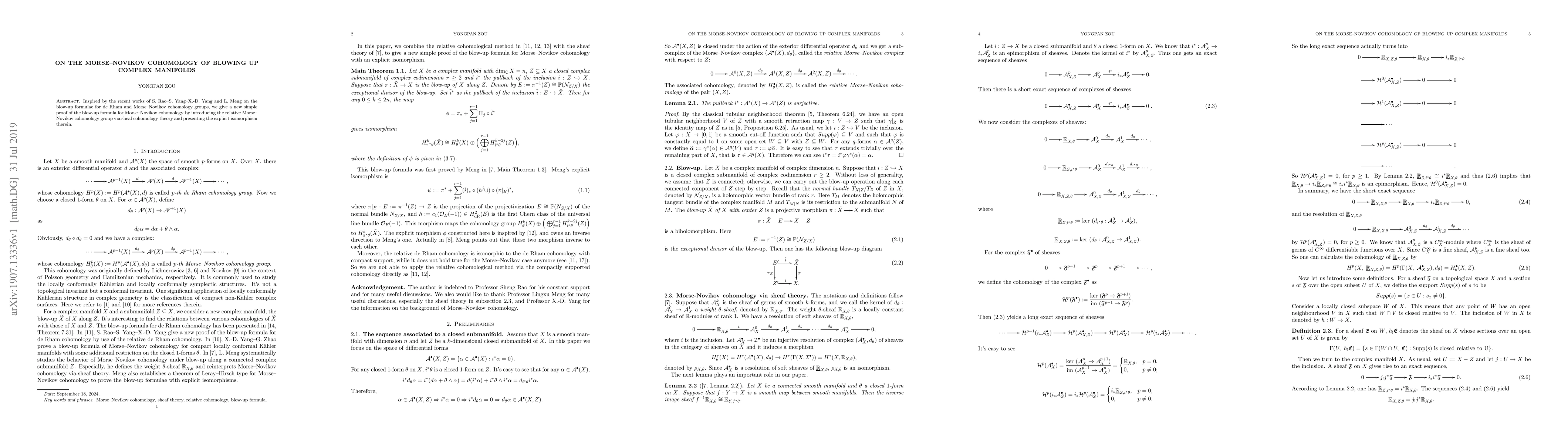 Inspired by the recent works of S. Rao--S. Yang--X.-D. Yang and L. Meng on the blow-up formulae for de Rham and Morse--Novikov cohomology groups, we give a new simple proof of the blow-up formula for Morse--Novikov cohomology by introducing the relative Morse--Novikov cohomology group via sheaf cohomology theory and presenting the explicit isomorphism therein.