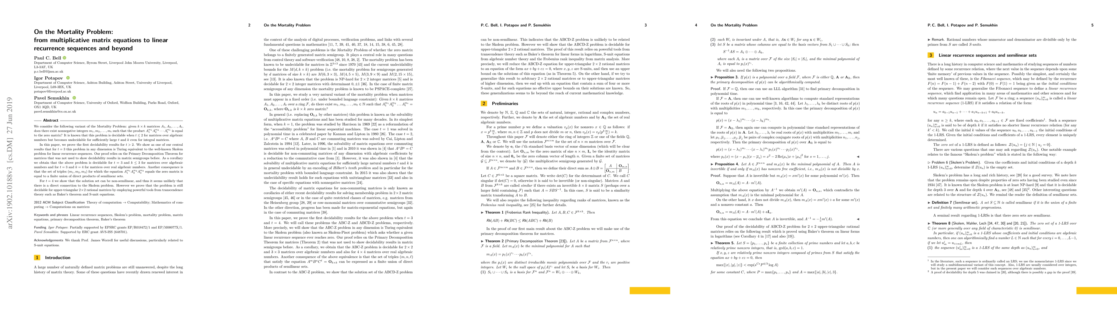 We consider the following variant of the Mortality Problem: given $k\times k$ matrices $A_1, A_2, \dots,A_{t}$, does there exist nonnegative integers $m_1, m_2, \dots,m_t$ such that the product $A_1^{m_1} A_2^{m_2} \cdots A_{t}^{m_{t}}$ is equal to the zero matrix? It is known that this problem is decidable when $t \leq 2$ for matrices over algebraic numbers but becomes undecidable for sufficiently large $t$ and $k$ even for integral matrices. In this paper, we prove the first decidability results for $t>2$. We show as one of our central results that for $t=3$ this problem in any dimension is Turing equivalent to the well-known Skolem problem for linear recurrence sequences. Our proof relies on the Primary Decomposition Theorem for matrices that was not used to show decidability results in matrix semigroups before. As a corollary we obtain that the above problem is decidable for $t=3$ and $k \leq 3$ for matrices over algebraic numbers and for $t=3$ and $k=4$ for matrices over real algebraic numbers. Another consequence is that the set of triples $(m_1,m_2,m_3)$ for which the equation $A_1^{m_1} A_2^{m_2} A_3^{m_3}$ equals the zero matrix is equal to a finite union of direct products of semilinear sets. For $t=4$ we show that the solution set can be non-semilinear, and thus it seems unlikely that there is a direct connection to the Skolem problem. However we prove that the problem is still decidable for upper-triangular $2 \times 2$ rational matrices by employing powerful tools from transcendence theory such as Baker's theorem and S-unit equations.