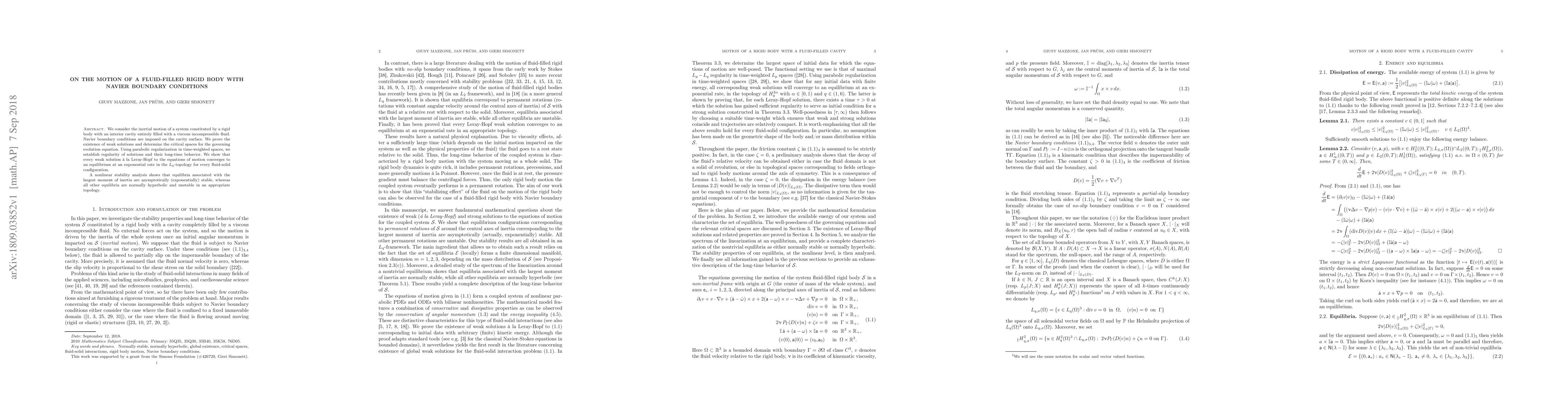 This paper explores the motion of a rigid body with a cavity filled with viscous incompressible fluid, governed by Navier boundary conditions. It proves the existence of weak solutions and establishes their regularity and long-term behavior, showing exponential convergence to stable equilibria for configurations with the largest moment of inertia.