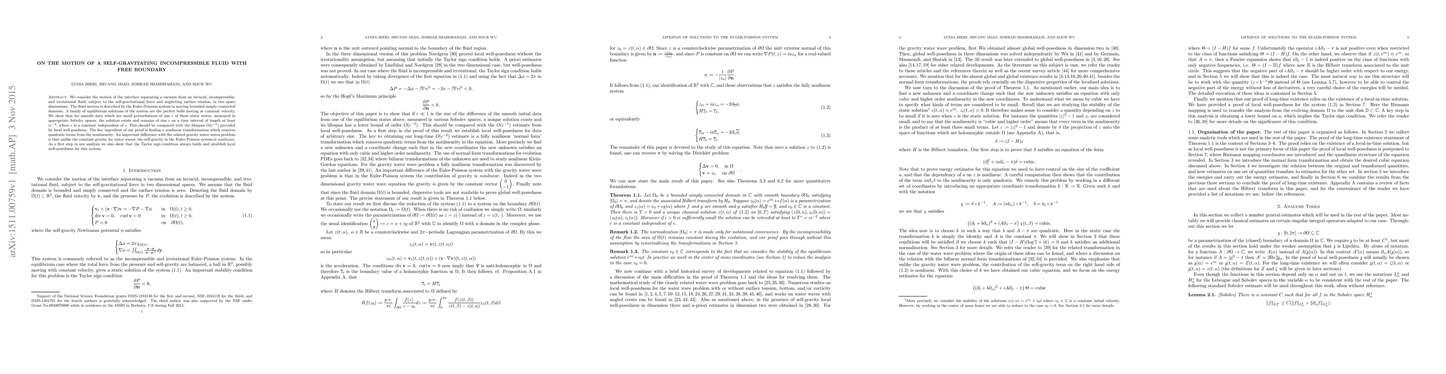 We consider the motion of the interface separating a vacuum from an inviscid, incompressible, and irrotational fluid, subject to the self-gravitational force and neglecting surface tension, in two space dimensions. The fluid motion is described by the Euler-Poission system in moving bounded simply connected domains. A family of equilibrium solutions of the system are the perfect balls moving at constant velocity. We show that for smooth data which are small perturbations of size $\epsilon$ of these static states, measured in appropriate Sobolev spaces, the solution exists and remains of size $\epsilon$ on a time interval of length at least $c\epsilon^{-2},$ where $c$ is a constant independent of $\epsilon.$ This should be compared with the lifespan $O(\epsilon^{-1})$ provided by local well-posdness. The key ingredient of our proof is finding a nonlinear transformation which removes quadratic terms from the nonlinearity. An important difference with the related gravity water waves problem is that unlike the constant gravity for water waves, the self-gravity in the Euler-Poisson system is nonlinear. As a first step in our analysis we also show that the Taylor sign condition always holds and establish local well-posedness for this system.