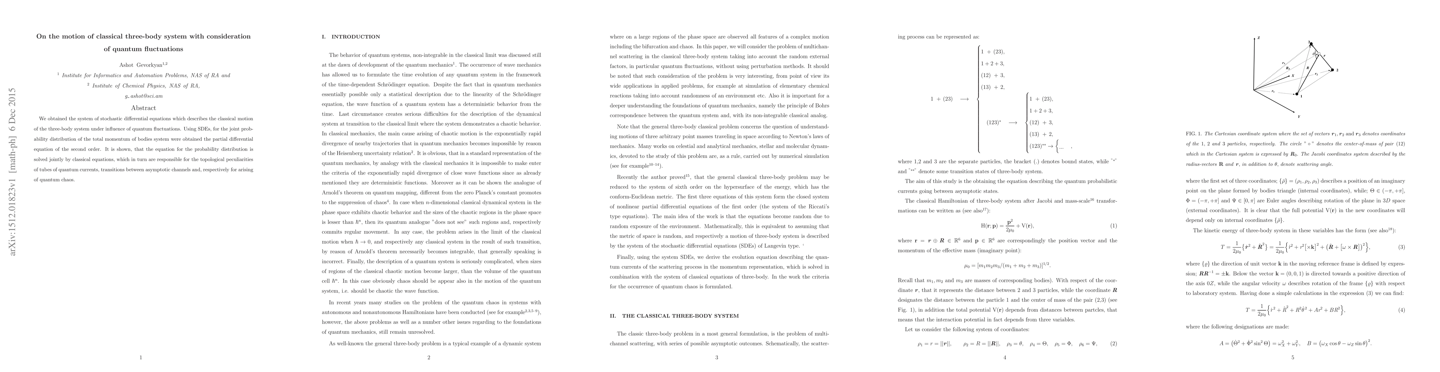 This paper investigates the classical three-body system with quantum fluctuations, formulating it as a point mass motion on a curved hypersurface. It derives stochastic differential equations to describe the system's motion, revealing the interplay between classical chaos and quantum probabilistic currents, and determines a measure for quantum chaos emergence.