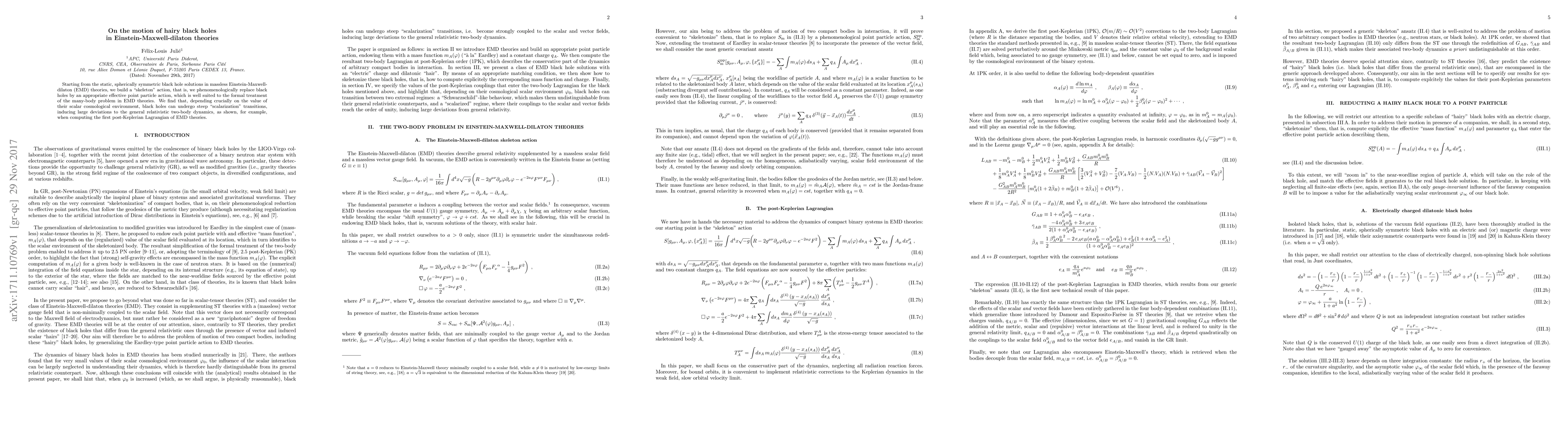Starting from the static, spherically symmetric black hole solutions in massless Einstein-Maxwell-dilaton (EMD) theories, we build a "skeleton" action, that is, we phenomenologically replace black holes by an appropriate effective point particle action, which is well suited to the formal treatment of the many-body problem in EMD theories. We find that, depending crucially on the value of their scalar cosmological environment, black holes can undergo steep "scalarization" transitions, inducing large deviations to the general relativistic two-body dynamics, as shown, for example, when computing the first post-Keplerian Lagrangian of EMD theories.
