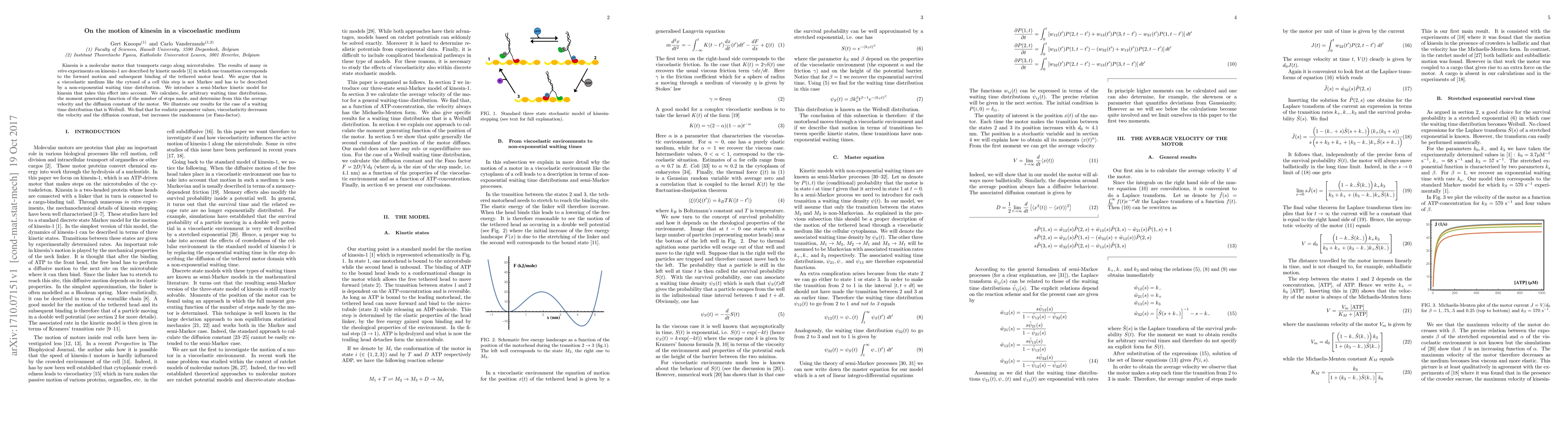Kinesin is a molecular motor that transports cargo along microtubules. The results of many {\it in vitro} experiments on kinesin-1 are described by kinetic models \cite{Clancy11} in which one transition corresponds to the forward motion and subsequent binding of the tethered motor head. We argue that in a viscoelastic medium like the cytosol of a cell this step is not Markov and has to be described by a non-exponential waiting time distribution. We introduce a semi-Markov kinetic model for kinesin that takes this effect into account. We calculate, for arbitrary waiting time distributions, the moment generating function of the number of steps made, and determine from this the average velocity and the diffusion constant of the motor. We illustrate our results for the case of a waiting time distribution that is Weibull. We find that for realistic parameter values, viscoelasticity decreases the velocity and the diffusion constant, but increases the randomness (or Fano-factor).