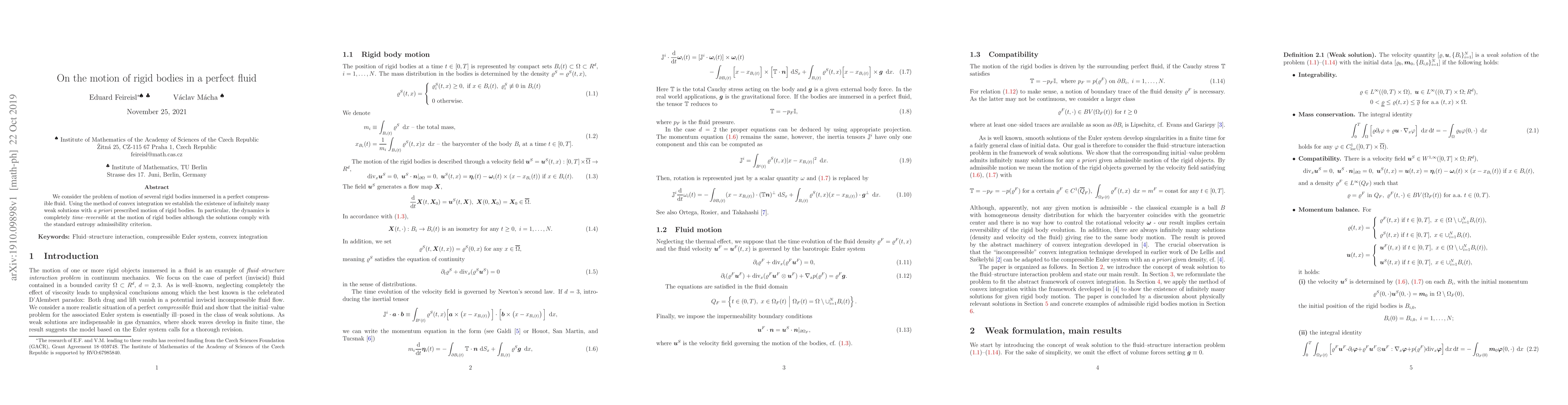 The paper establishes the existence of weak solutions for rigid bodies in a perfect compressible fluid using convex integration, demonstrating time-reversible dynamics and compliance with entropy criteria. The solutions exhibit prescribed motion of the rigid bodies despite the fluid’s perfect nature.