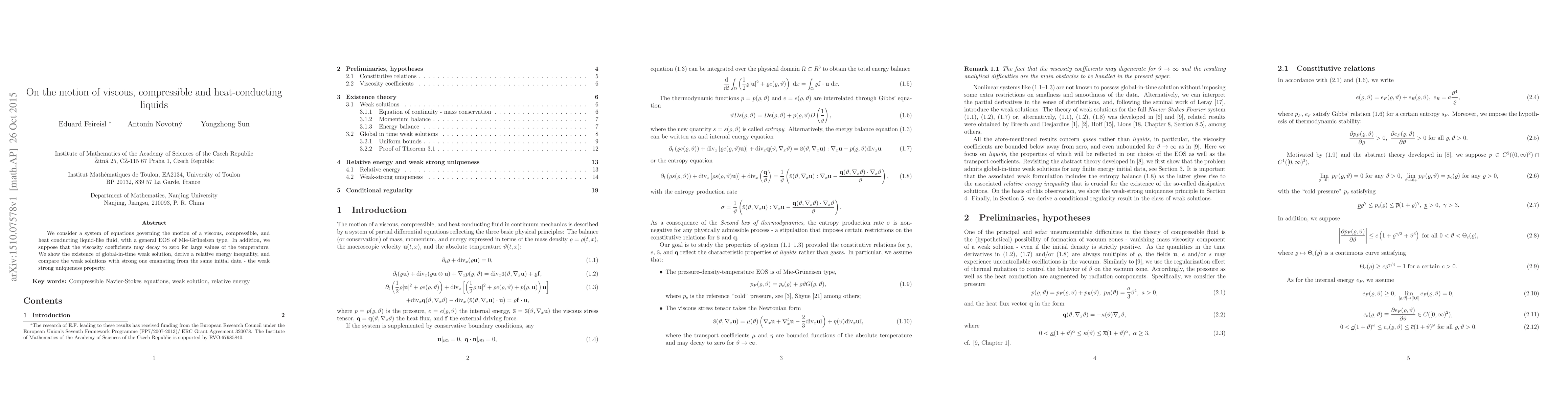 We consider a system of equations governing the motion of a viscous, compressible, and heat conducting liquid-like fluid, with a general EOS of Mie-Grueneisen type. In addition, we suppose that the viscosity coefficients may decay to zero for large values of the temperature. We show the existence of global-in-time weak solution, derive a relative energy inequality, and compare the weak solutions with strong one emanating from the same initial data - the weak strong uniqueness property.