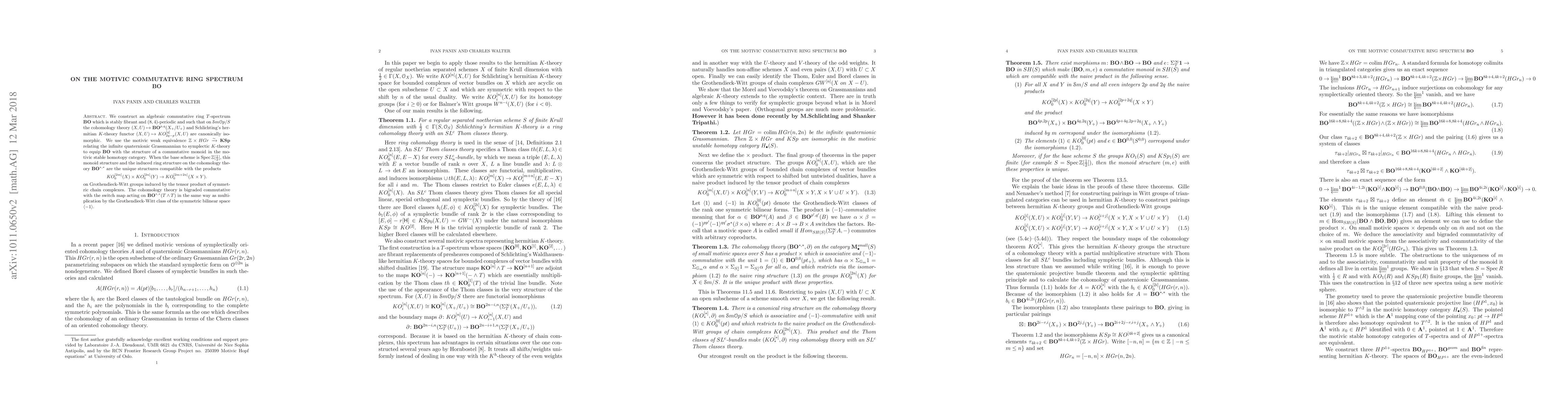 This paper constructs a motivic commutative ring spectrum BO, showing it is stably fibrant and (8,4)-periodic. It demonstrates an isomorphism between BO cohomology and Schlichting's hermitian K-theory, utilizing motivic weak equivalences to establish BO's structure as a commutative monoid in the motivic stable homotopy category.