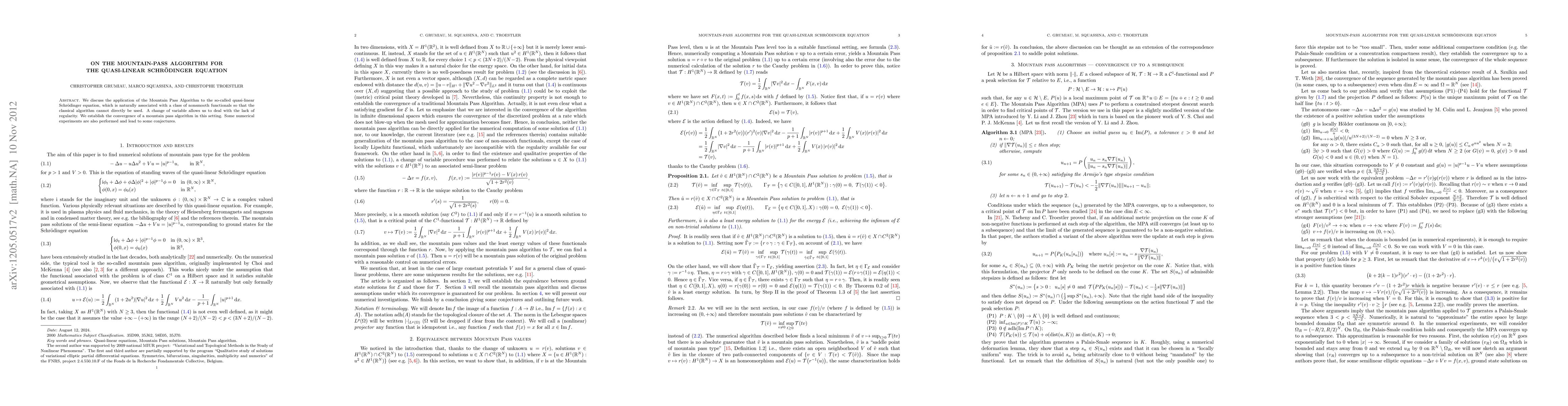 Summary: The paper explores the use of the Mountain Pass algorithm for solving the quasi-linear Schrödinger equation, addressing the challenges posed by its nonsmooth functionals where traditional methods fail. The study aims to extend the algorithm's applicability to this specific class of equations.