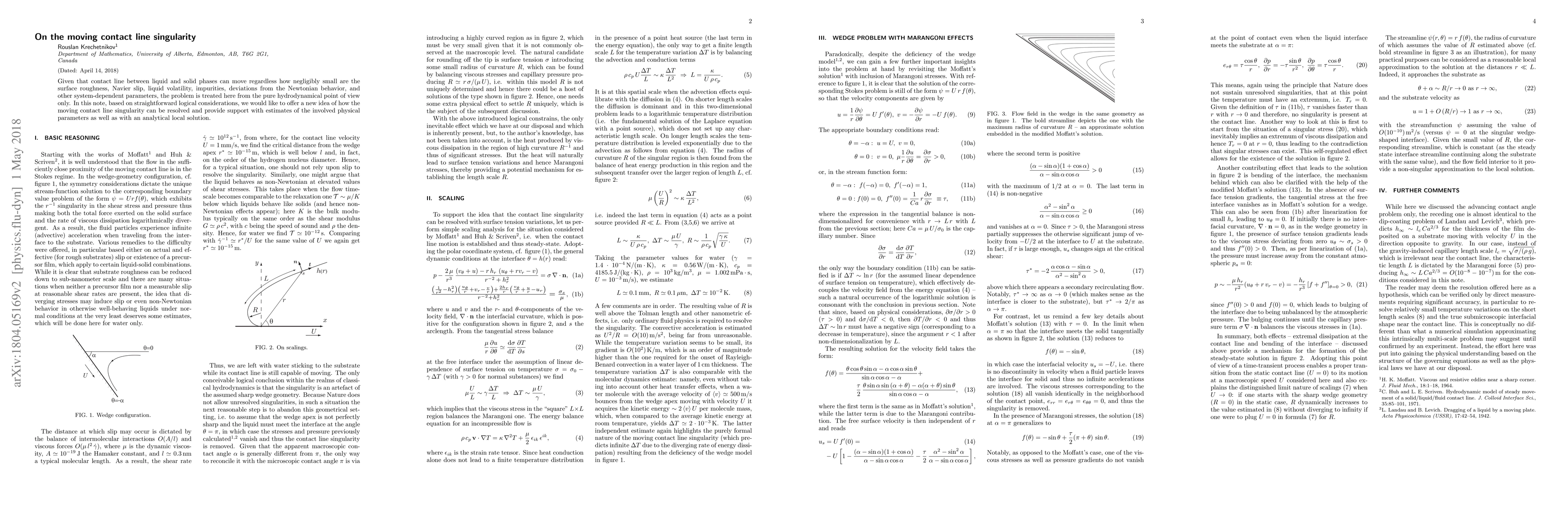 This paper proposes a new hydrodynamical approach to resolve the moving contact line singularity, focusing on logical considerations and providing estimates of involved physical parameters along with an analytical local solution.