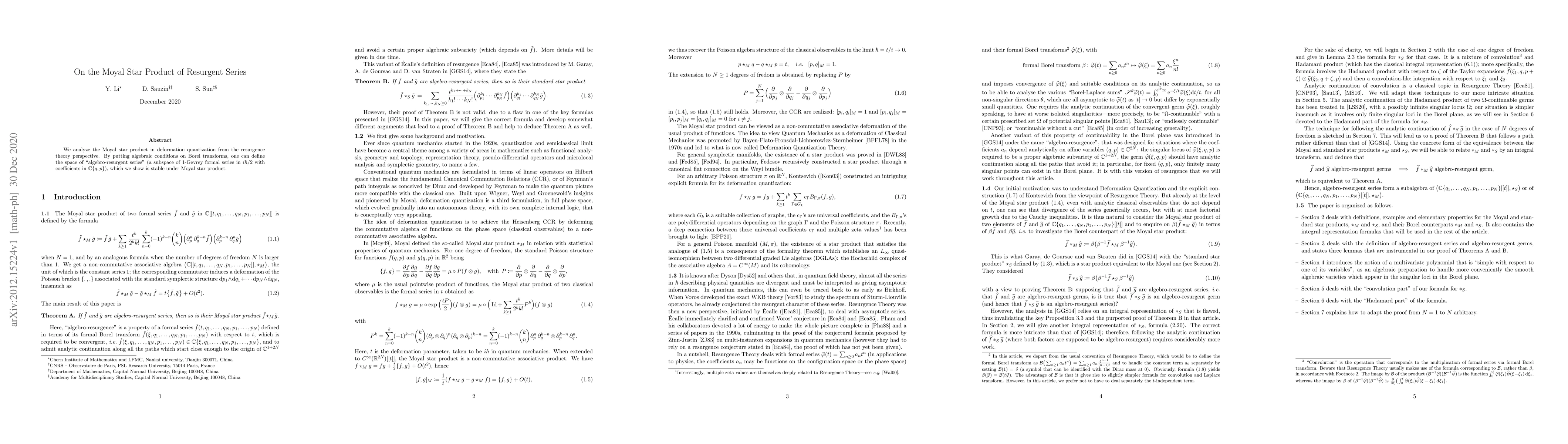 This paper explores the Moyal star product within deformation quantization through the lens of resurgence theory, defining a stable subspace of algebro-resurgent series under this product, which is a subset of $1$-Gevrey formal series.