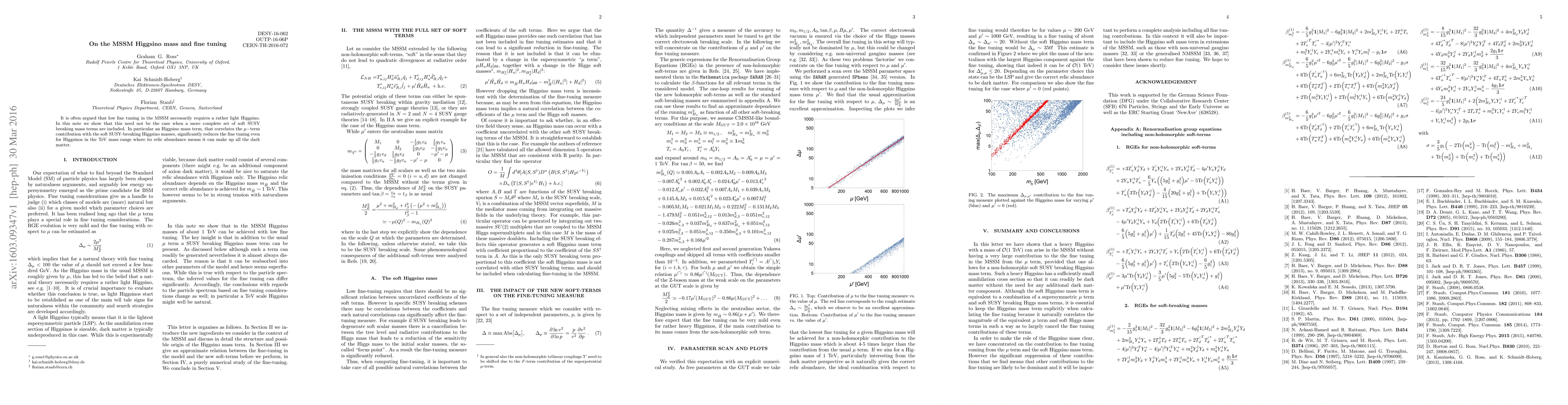 It is often argued that low fine tuning in the MSSM necessarily requires a rather light Higgsino. In this note we show that this need not be the case when a more complete set of soft SUSY breaking mass terms are included. In particular an Higgsino mass term, that correlates the $\mu-$term contribution with the soft SUSY-breaking Higgsino masses, significantly reduces the fine tuning even for Higgsinos in the TeV mass range where its relic abundance means it can make up all the dark matter.