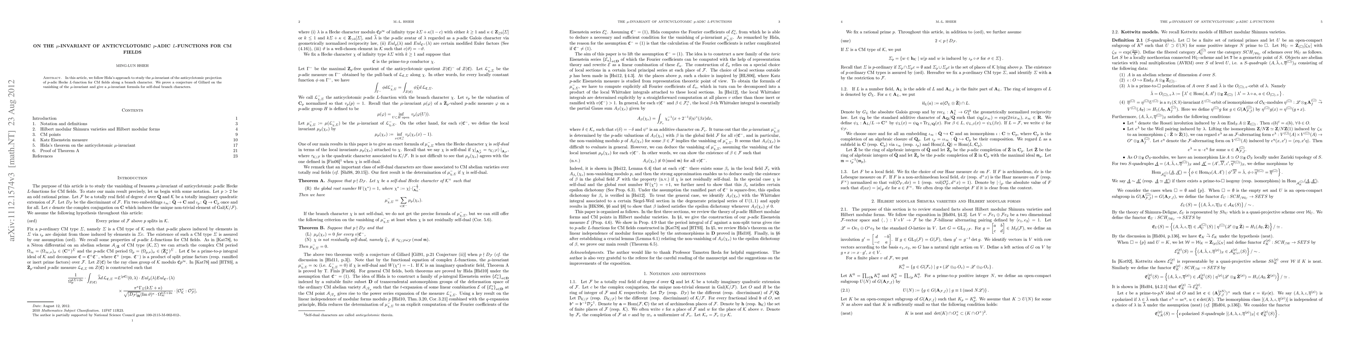 This paper investigates the mu-invariant of anticyclotomic p-adic L-functions for CM fields, proving Gillard's conjecture on its vanishing and providing a precise formula for self-dual branch characters using Hida's methodology.
