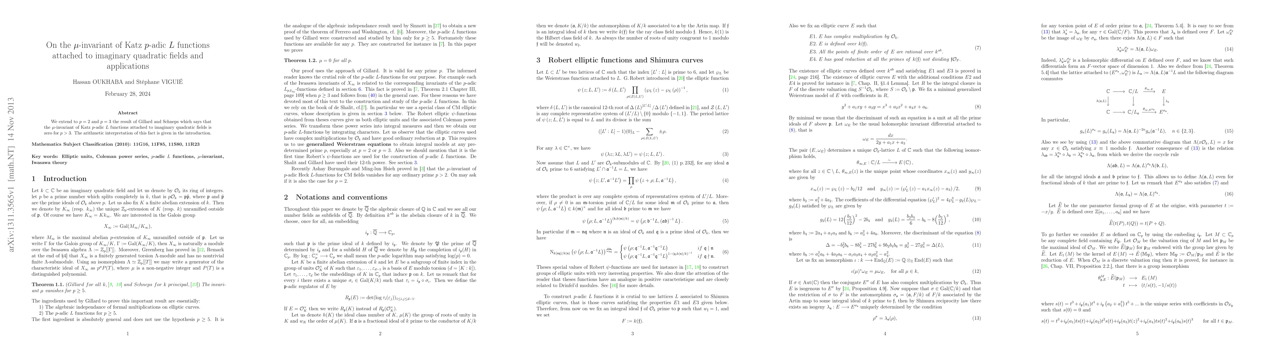 We extend to $p=2$ and $p=3$ the result of Gillard and Schneps which says that the $\mu$-invariant of Katz $p$-adic $L$ functions attached to imaginary quadratic fields is zero for $p>3$. The arithmetic interpretation of this fact is given in the introduction.